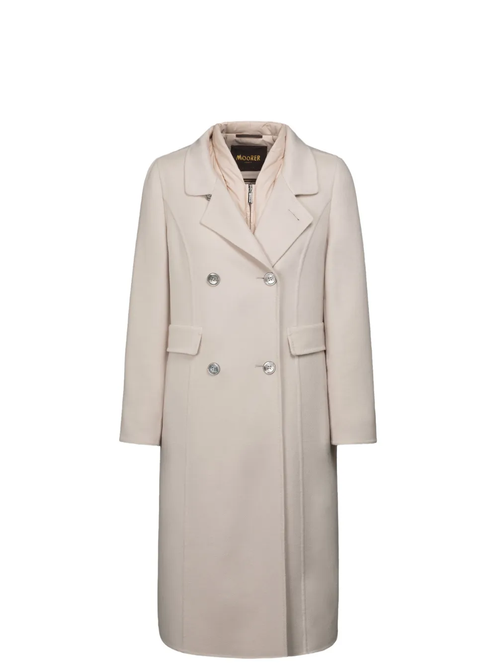 Кремовые лацканы с вырезом, застежка на двубортные пуговицы, прорезные карманы с клапанами, прямой низ