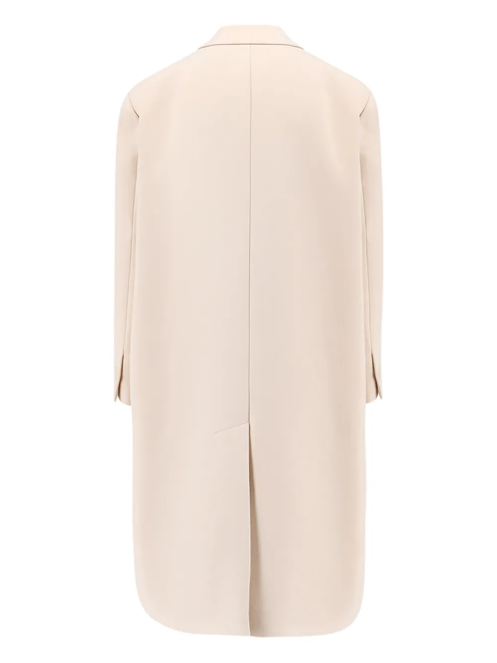 Белый двубортный пиджак, застежка на пуговицы, лацканы с вырезом, клапанные карманы, длинные рукава