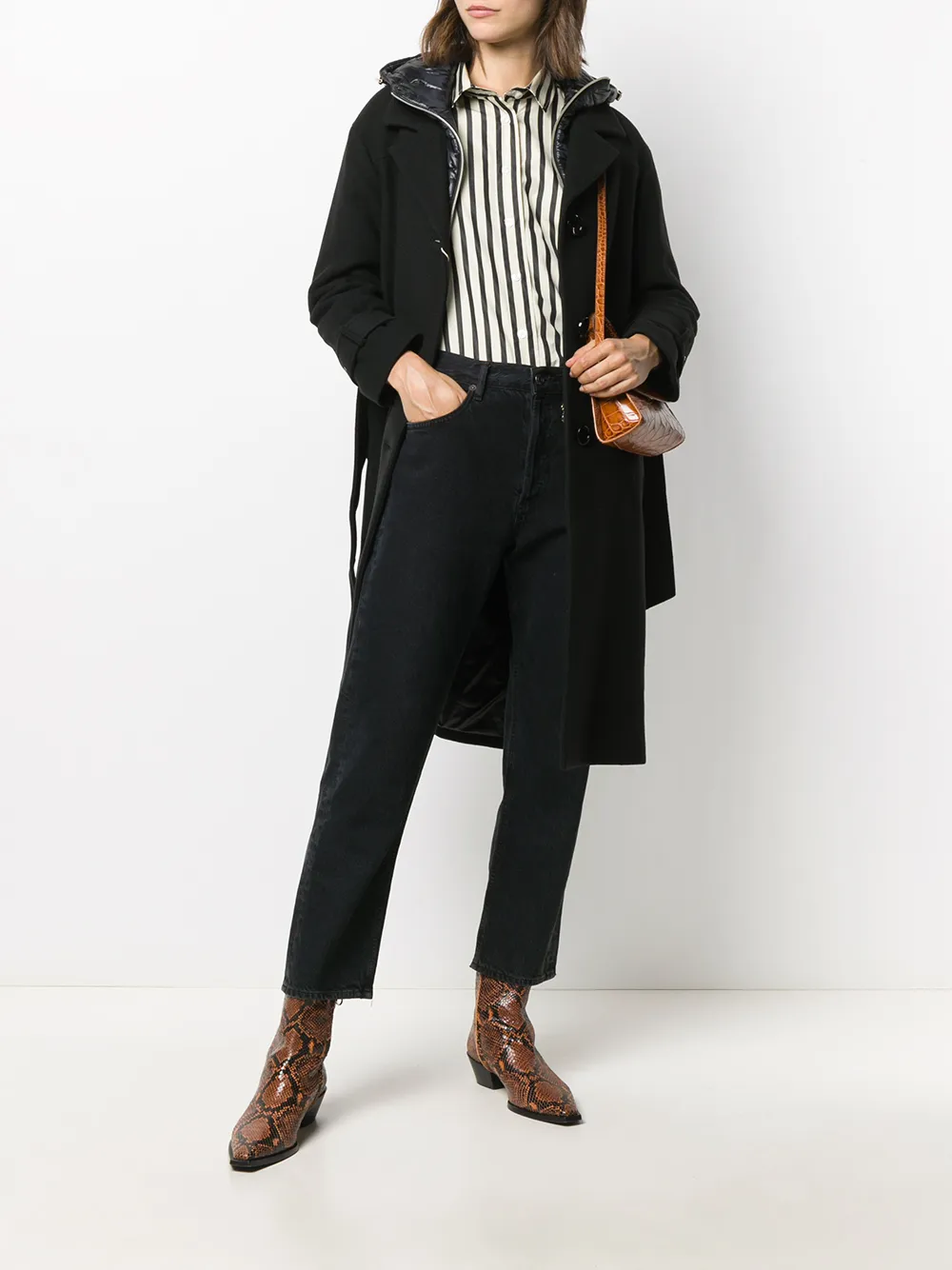 Застежка на кнопках спереди, воротник-стойка и длинные рукава.