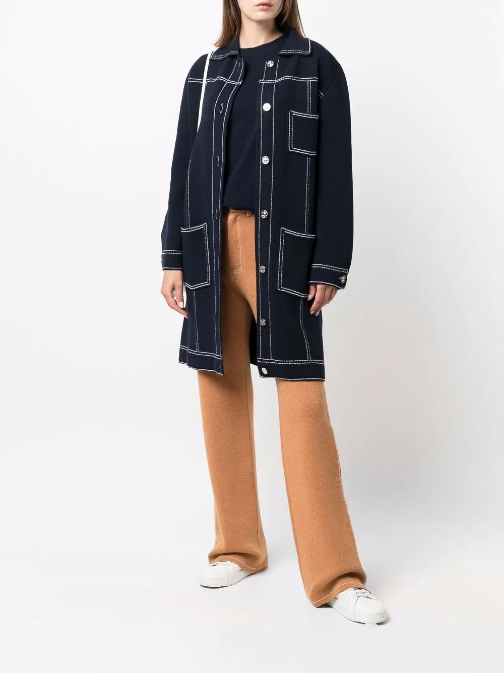 Контрастная строчка, классический воротник, застежка на пуговицах спереди и длинные рукава.