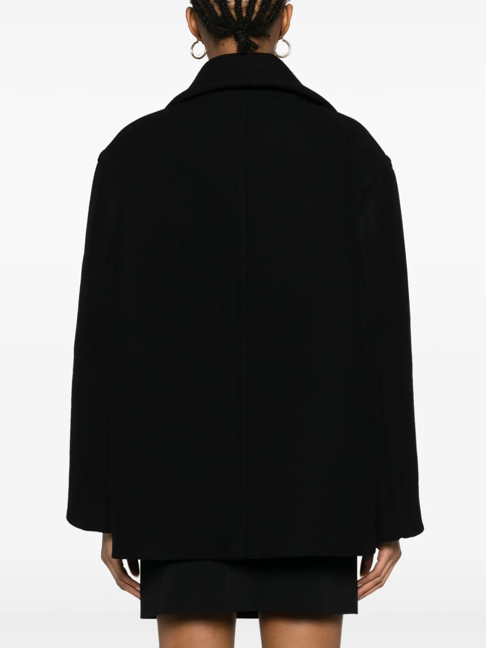 Черный, смесовая необработанная шерсть, широкие зазубренные лацканы, длинные рукава, двубортная застежка на кнопки, два боковых кармана с листочкой, шлица по центру сзади и прямой подол.