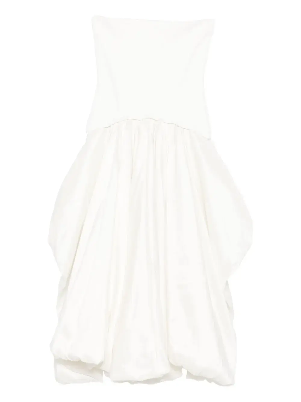Платье без бретелек с трикотажным верхом, плотно облегающим бюст, и изящно собранной по бокам тонкой тафтой. Смешанные материалы, длина миди, пузырчатый подол.