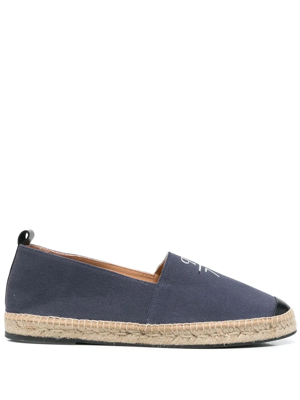 Темно-синий, черный, телячья кожа, логотип спереди, закругленный носок, кожаная отделка, петля для подтягивания сзади, модель без застежки, стелька с логотипом и плетеная подошва из рафии.