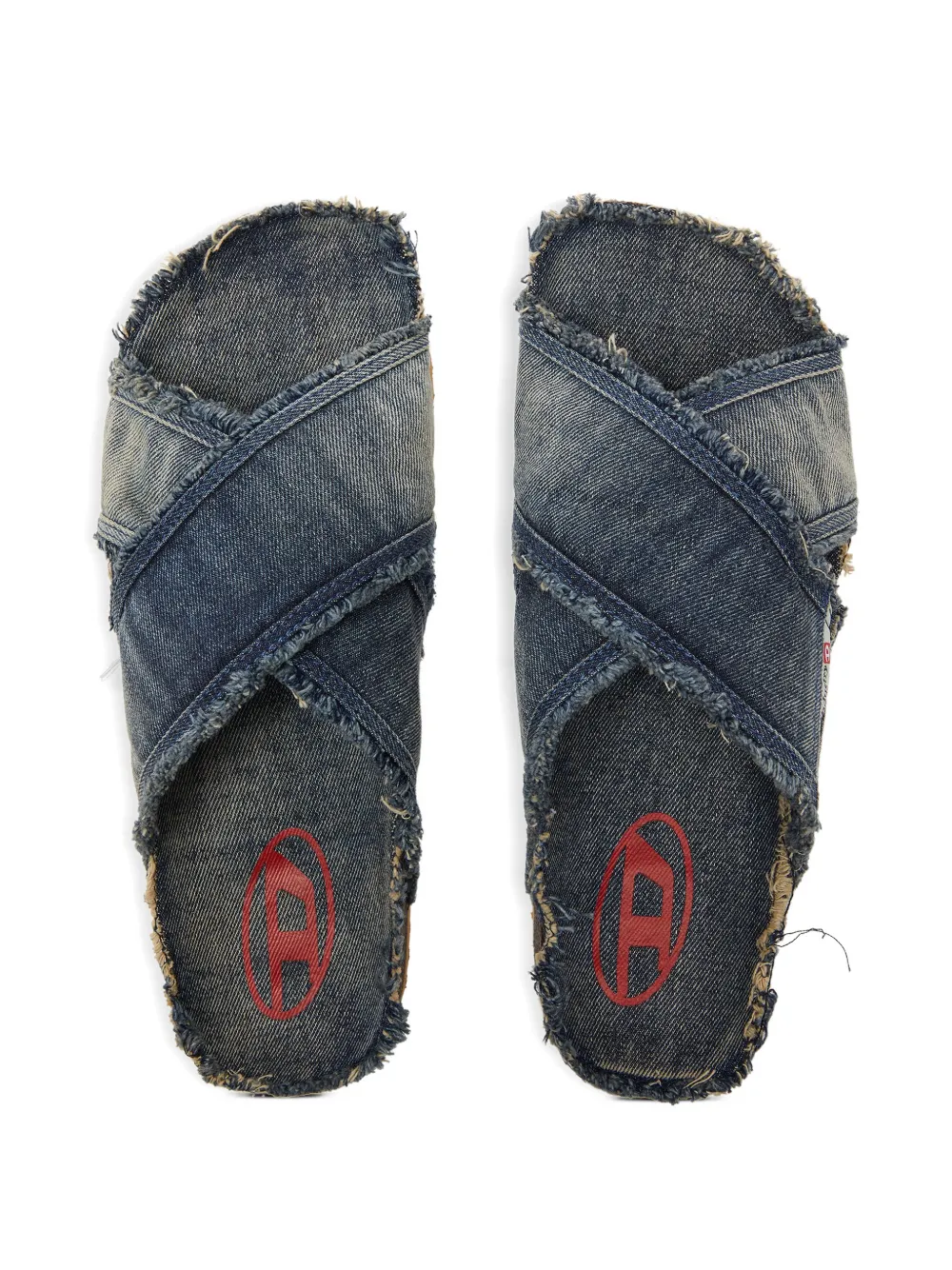 Светло-голубые перекрещивающиеся ремешки, необработанные края, плетёная нашивка с логотипом, анатомическая стелька, нескользящая подошва.