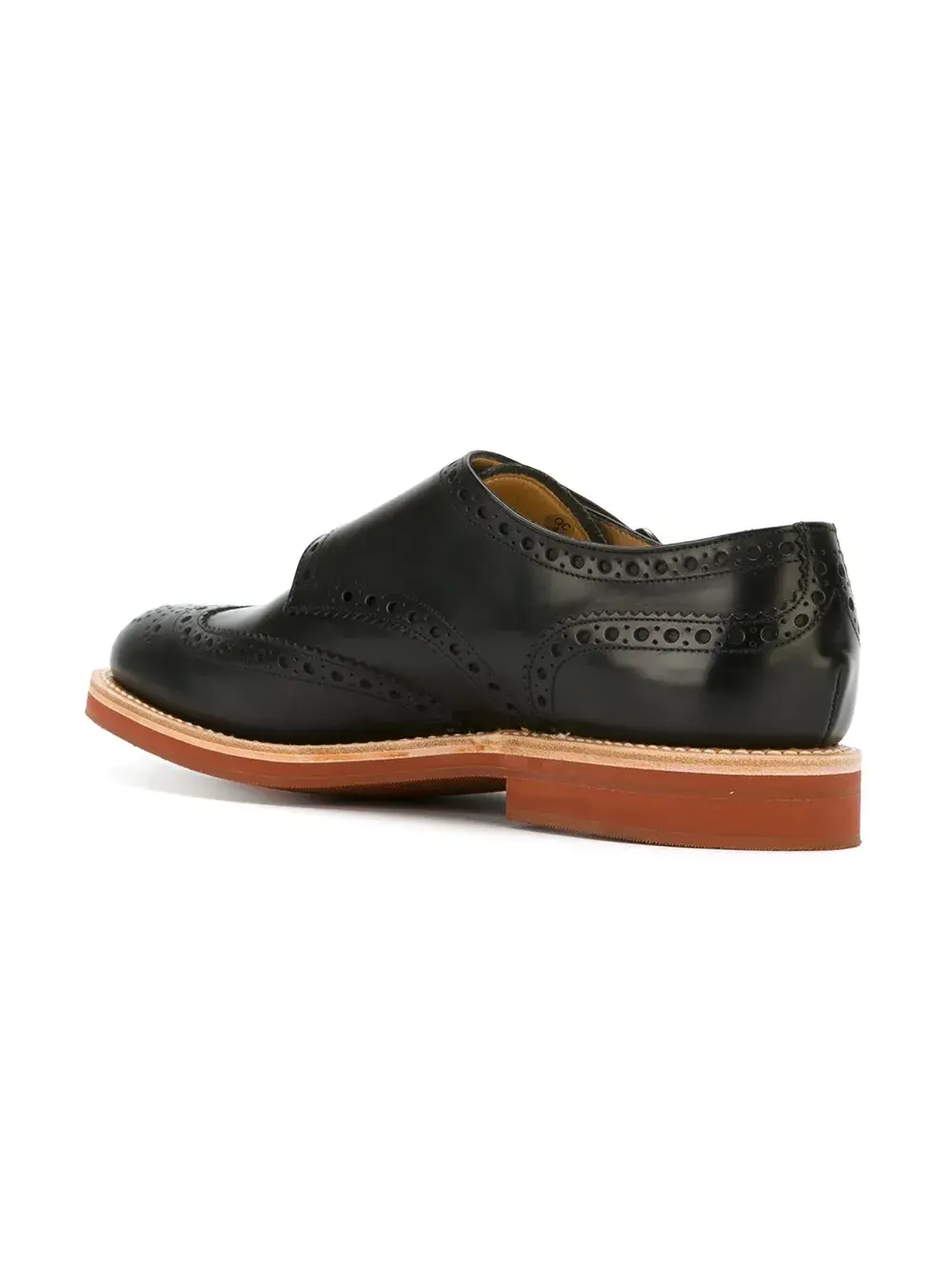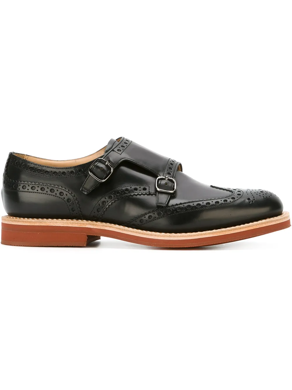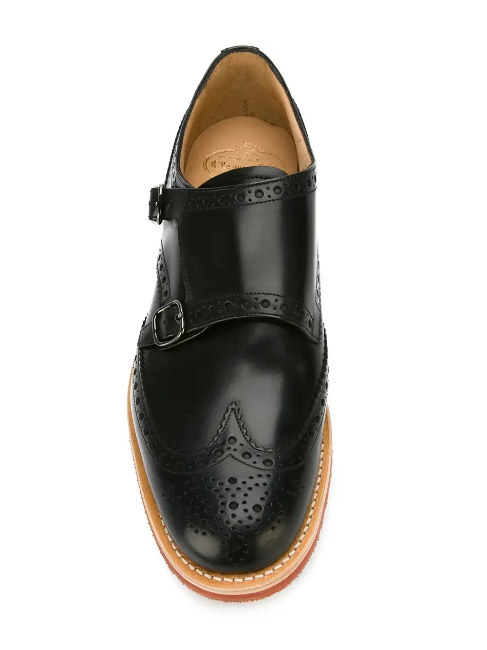 Черные кожаные туфли монки от Church's. Миндалевидный носок, боковая застежка на пряжке, стилистика брогов, стелька с тиснением бренда.
