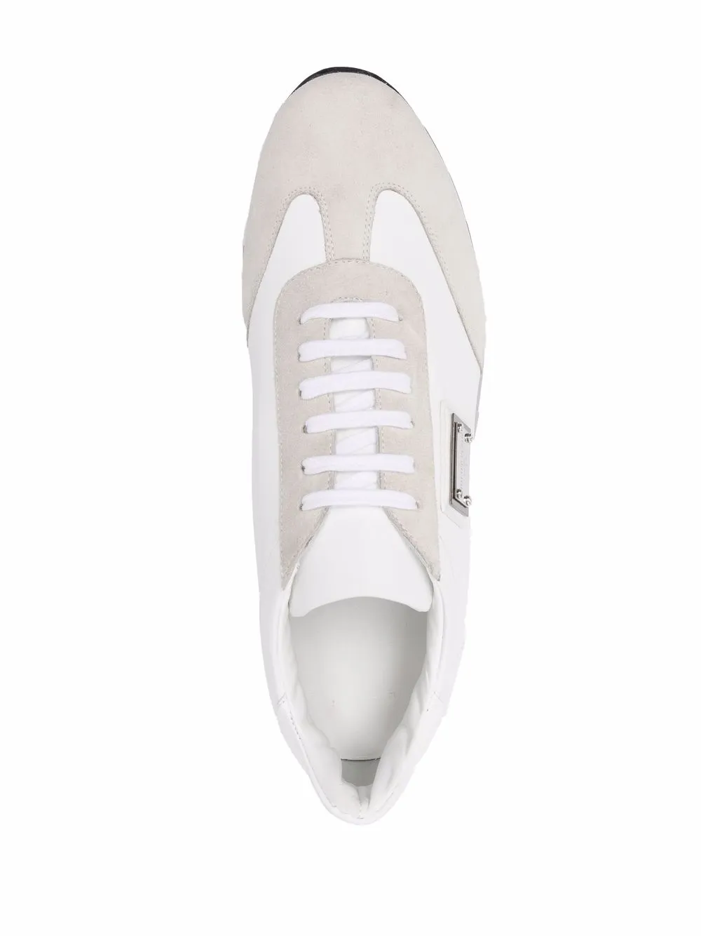 Серебристый металлический логотип, закругленный носок, шнуровка спереди, стелька с логотипом и плоская резиновая подошва.