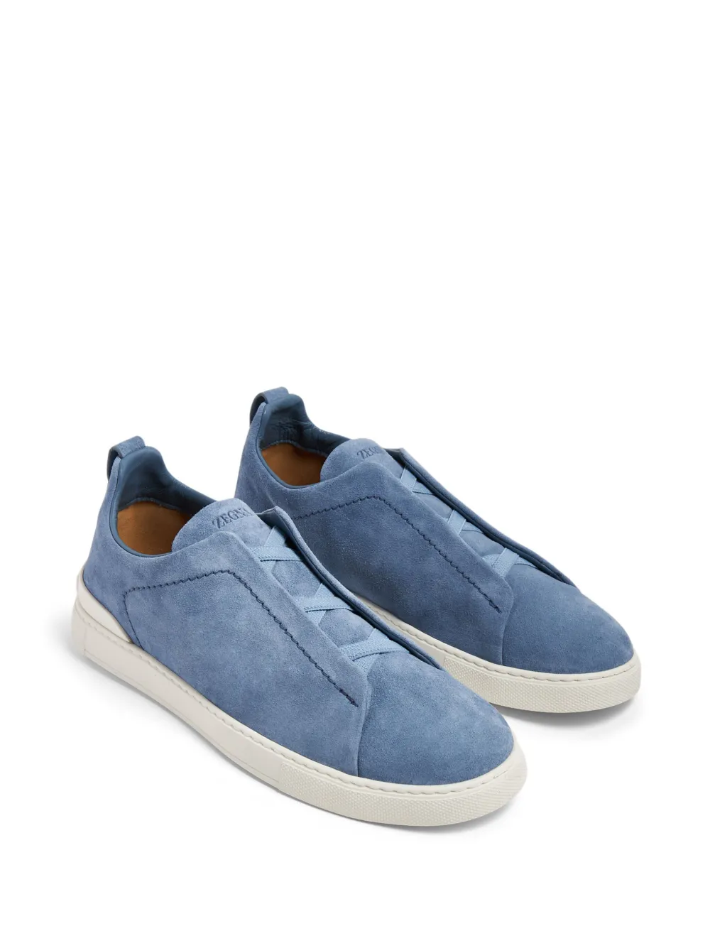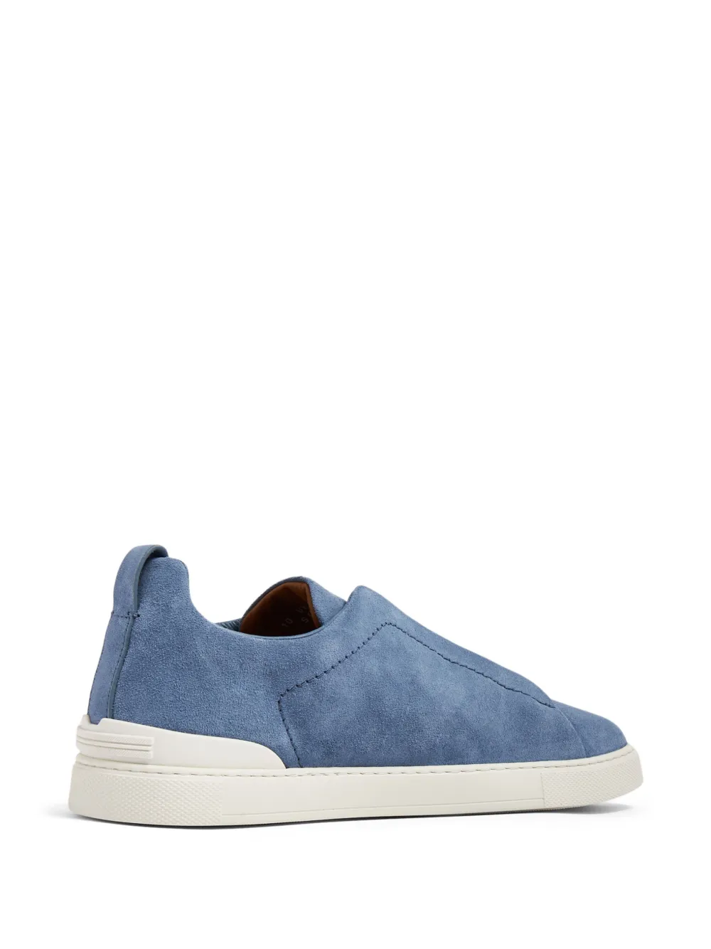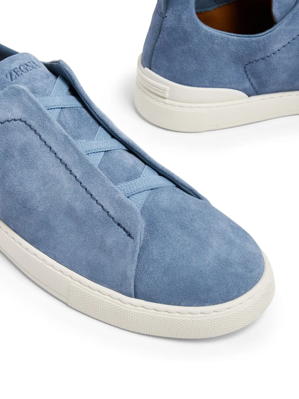 Васильковый, кожа, замша, тисненый логотип на язычке, петля для подтягивания сзади, закругленный носок, модель без застежки, стелька с логотипом и плоская резиновая подошва.