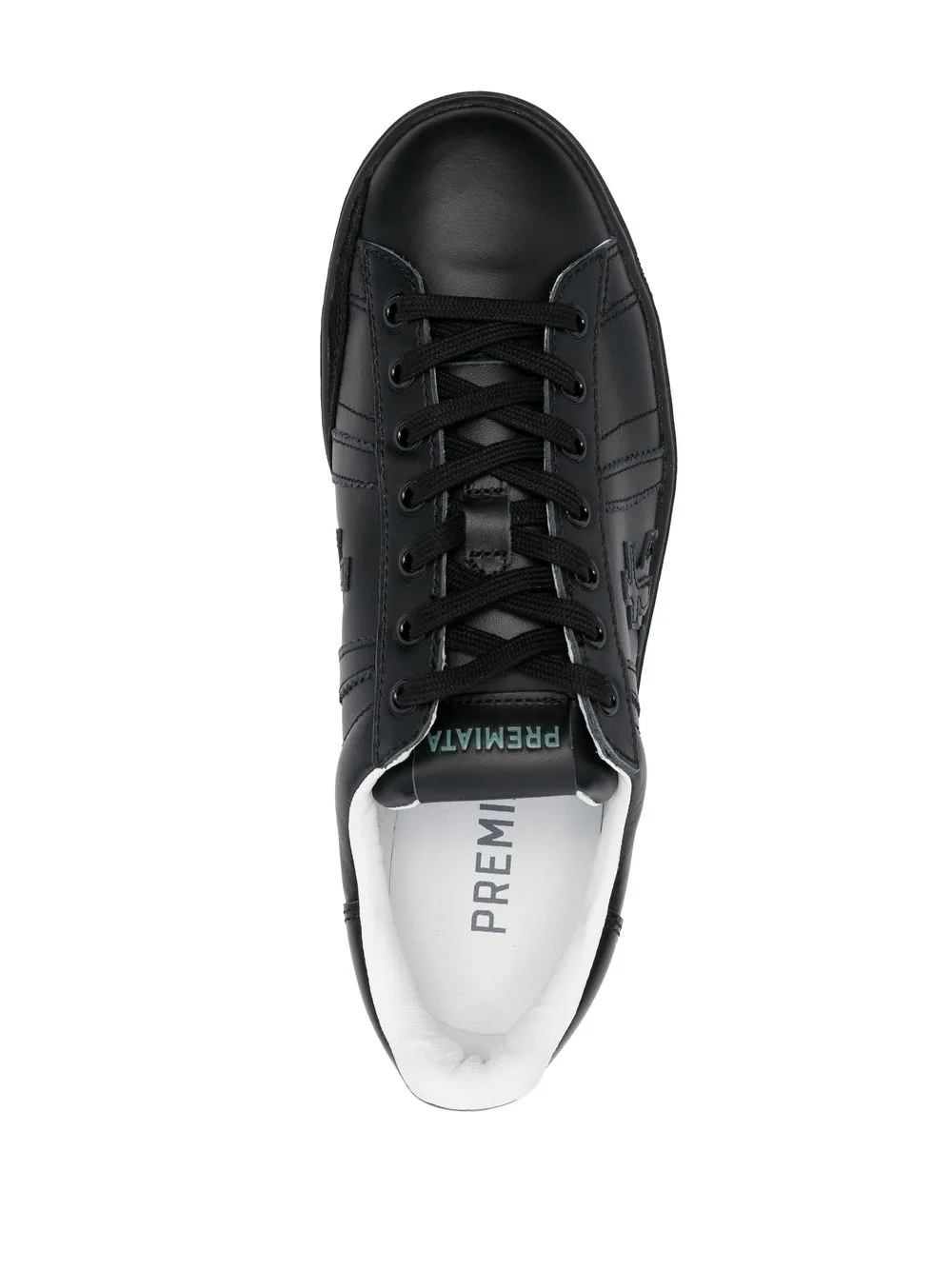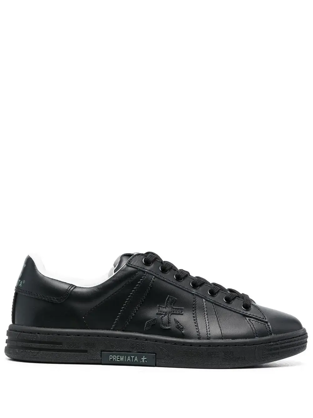Черный, телячья кожа, нашивка с логотипом на язычке, шнуровка спереди и плоская резиновая подошва.