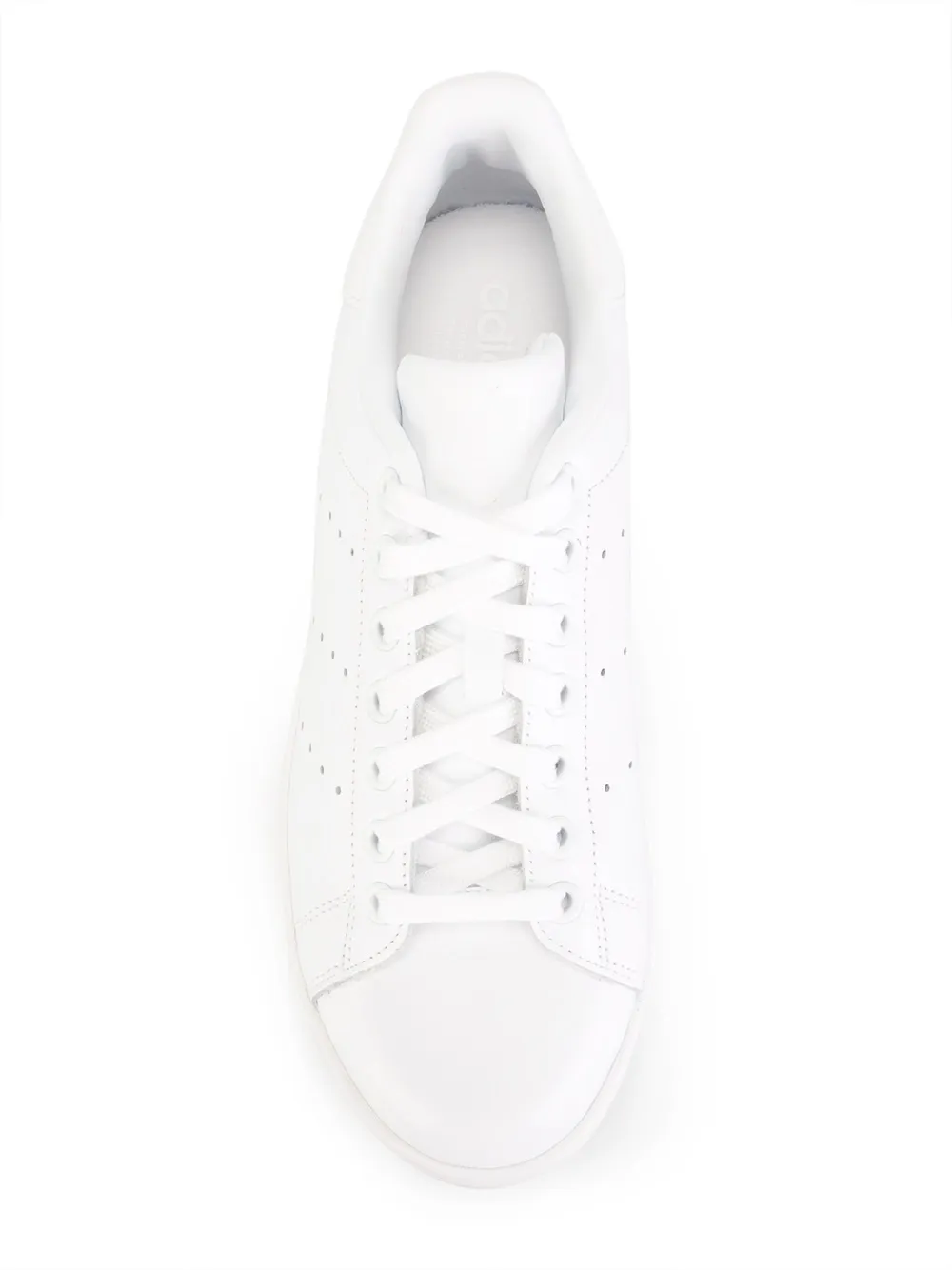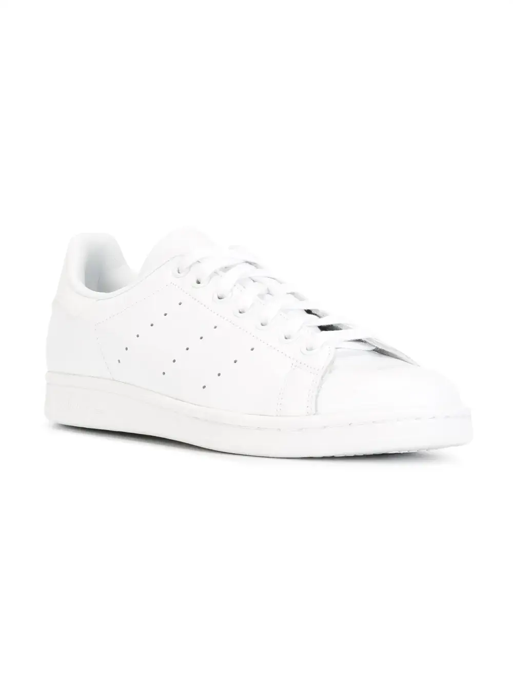 Белые кожаные кеды 'Stan Smith' от Adidas Originals. Закруглённый носок, шнуровка спереди, язычок с тиснением бренда, перфорированная деталь, утолщённая щиколотка, плоская резиновая подошва.