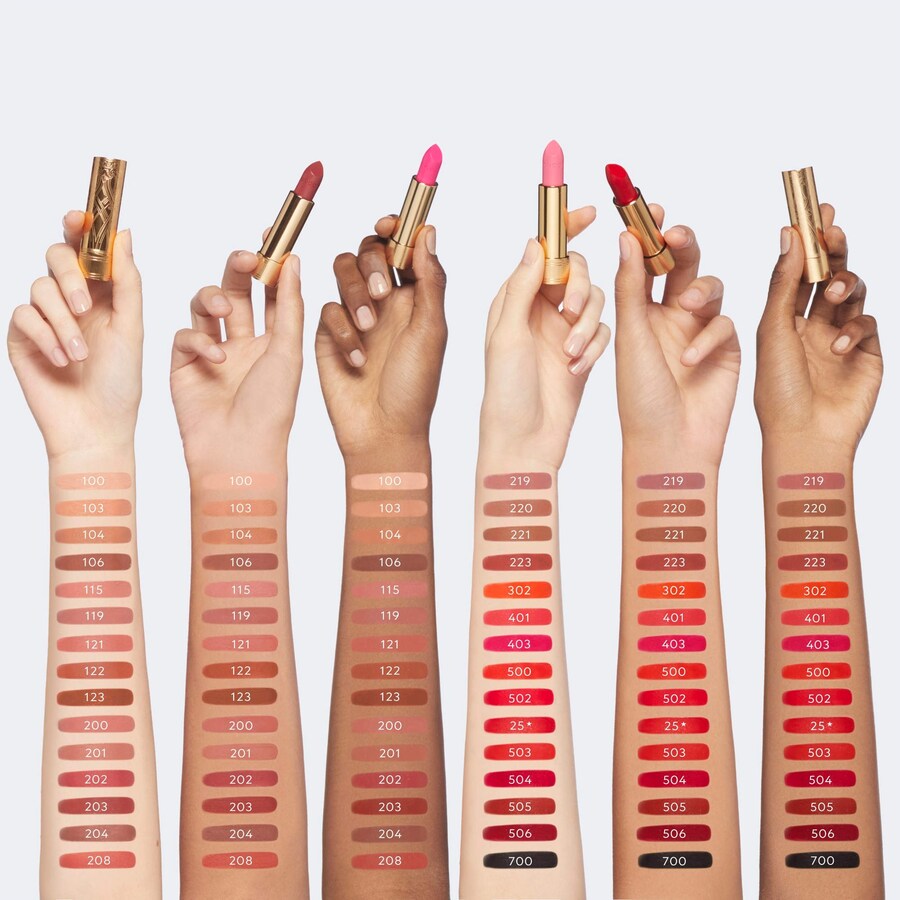 Что еще нужно знать: 36 оттенков варьируются от нюдовых до красных и розовых с нюансами оранжевого и фиолетового, а также один насыщенный черный оттенок. Помада Rouge à Lèvres Satin, упакованная в роскошный золотистый корпус, украшена декоративным рисунком Алессандро Микеле, вдохновленным стилем ар-деко.