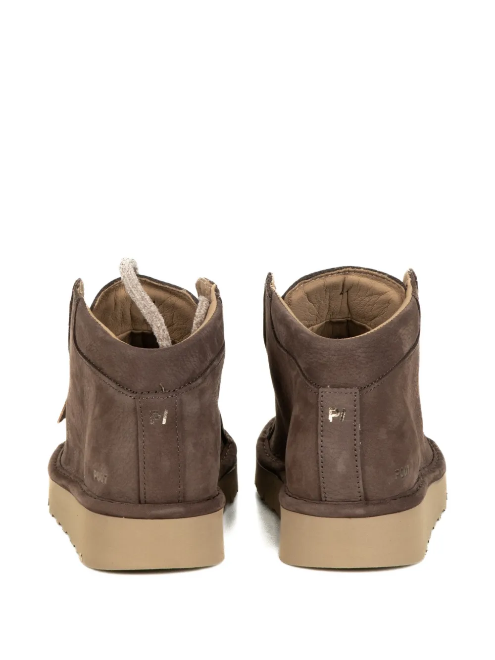 Кофейные шнурки, подошва на платформе, высота до щиколотки, простроченные детали, петля сзади