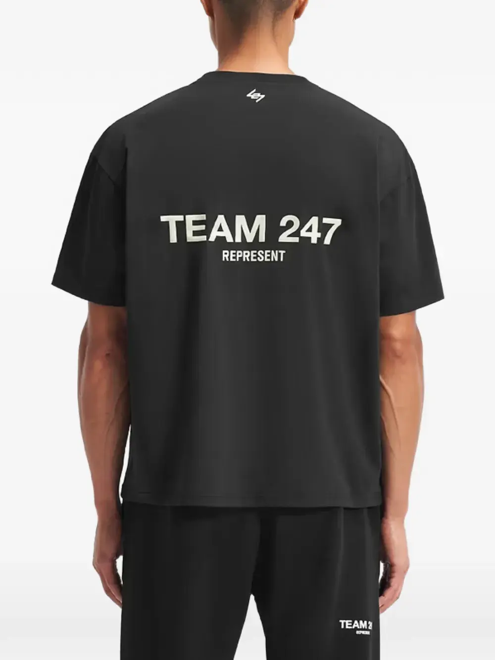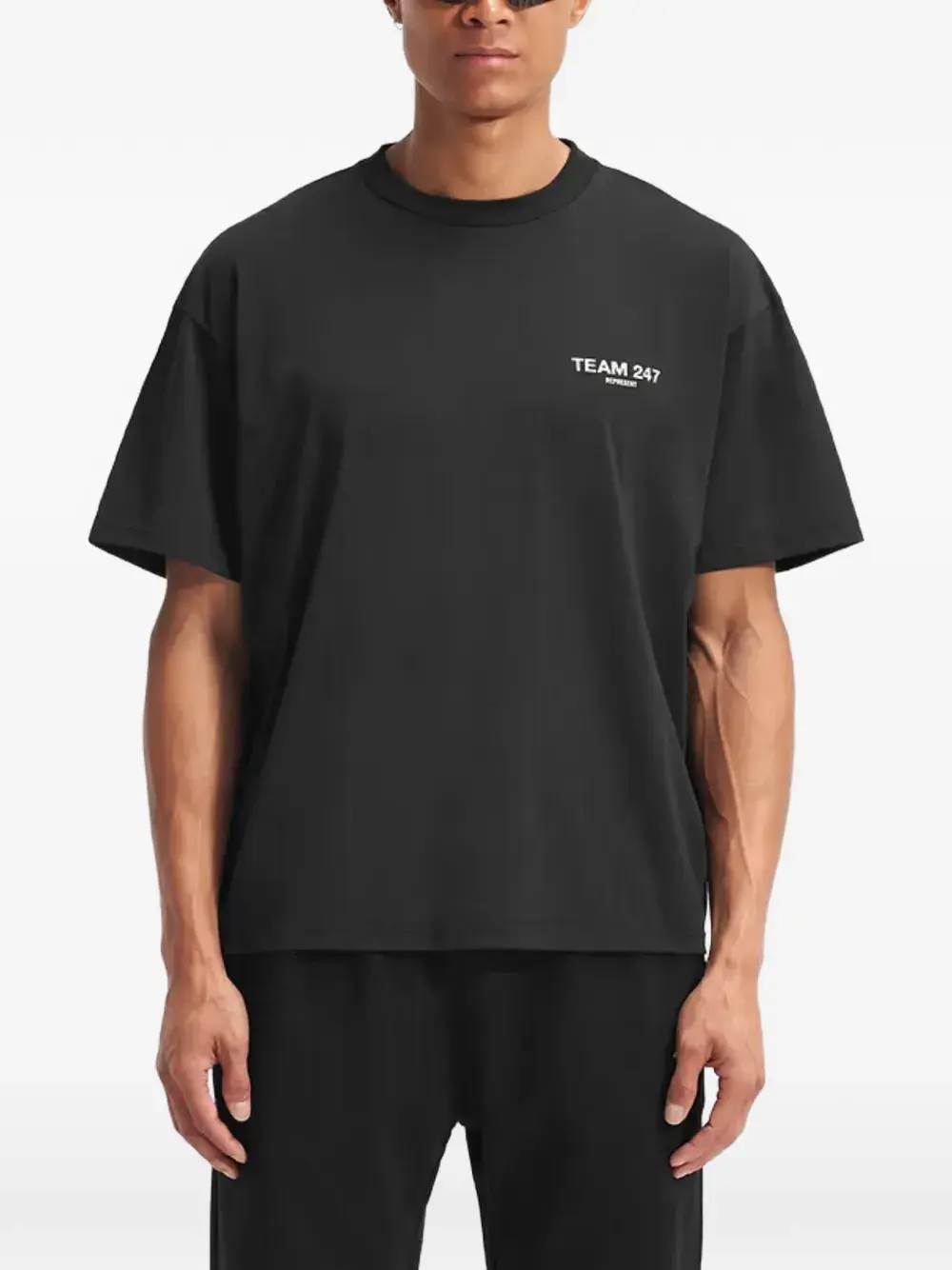 Черная футболка с круглым вырезом, принтом с надписью и короткими рукавами