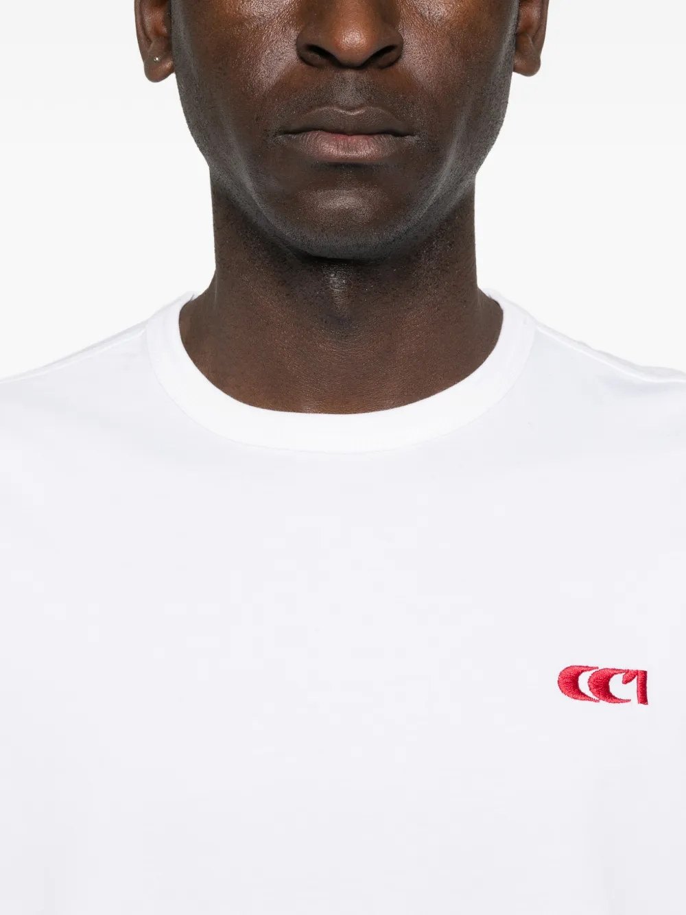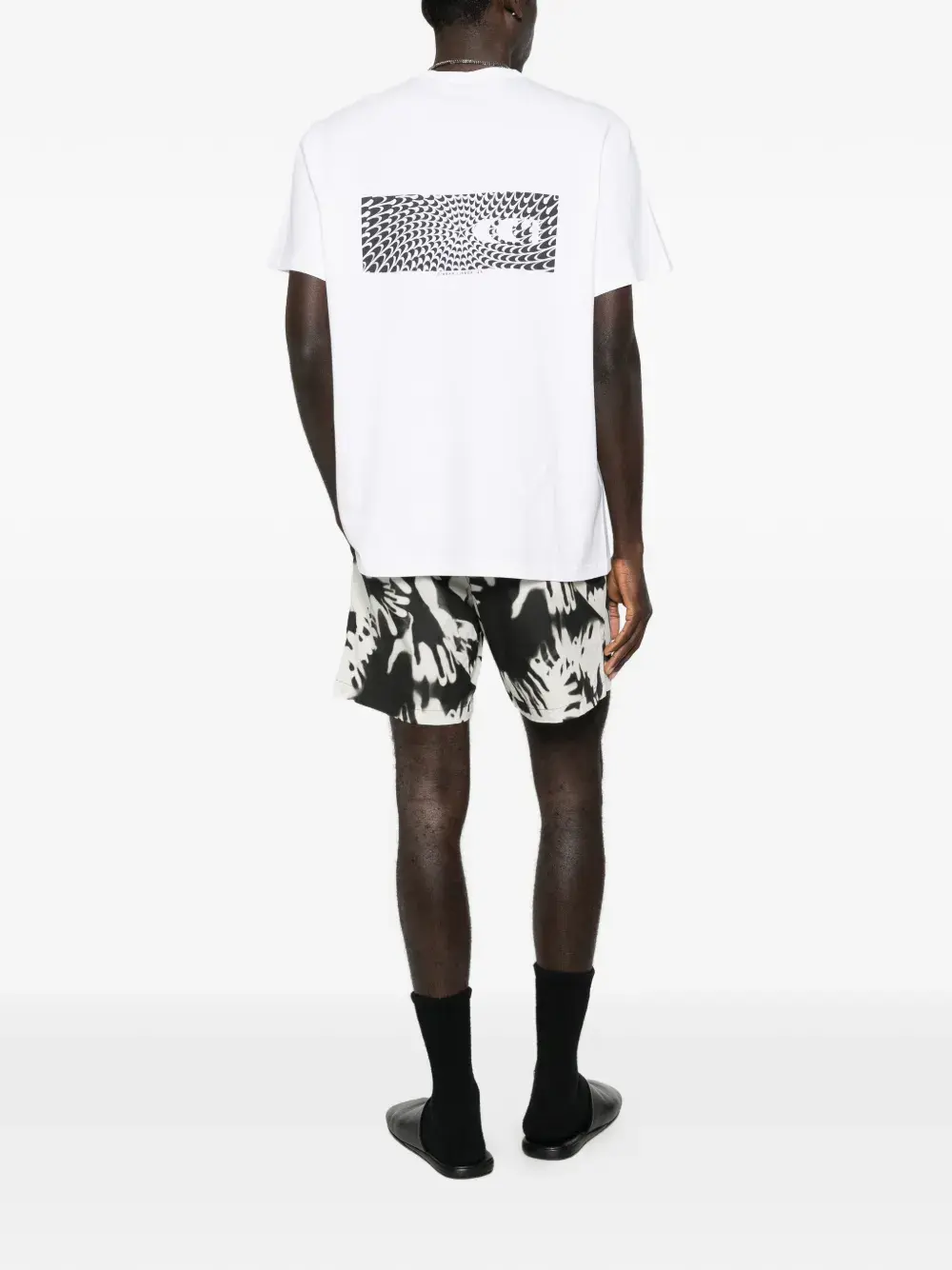 Белый цвет, графичный принт на спине, круглый вырез, короткие рукава