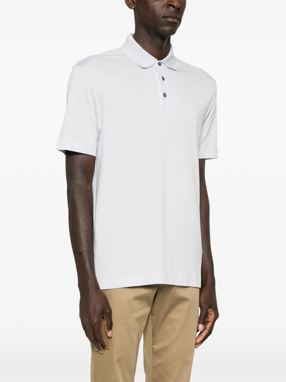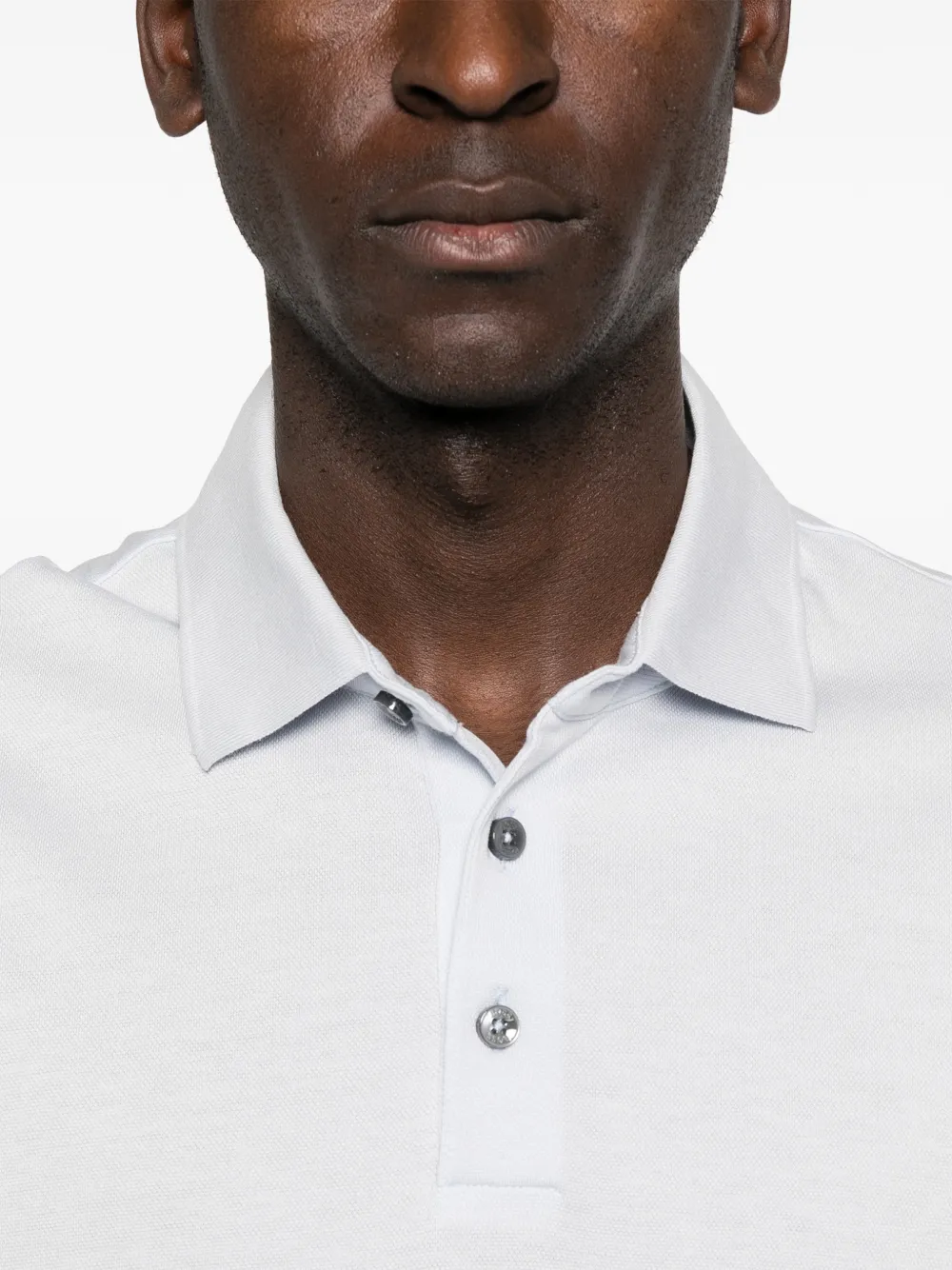 Светло-голубой, застегивающийся спереди на пуговицы, с короткими боковыми разрезами