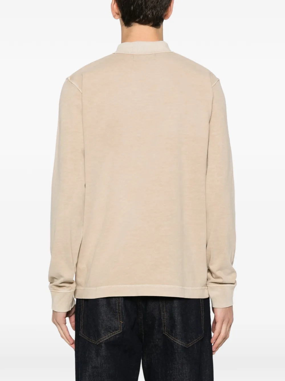 Нейтральные оттенки, длинные рукава, отложной воротник поло, манжеты в рубчик, вышитый логотип, застежка на пуговицы