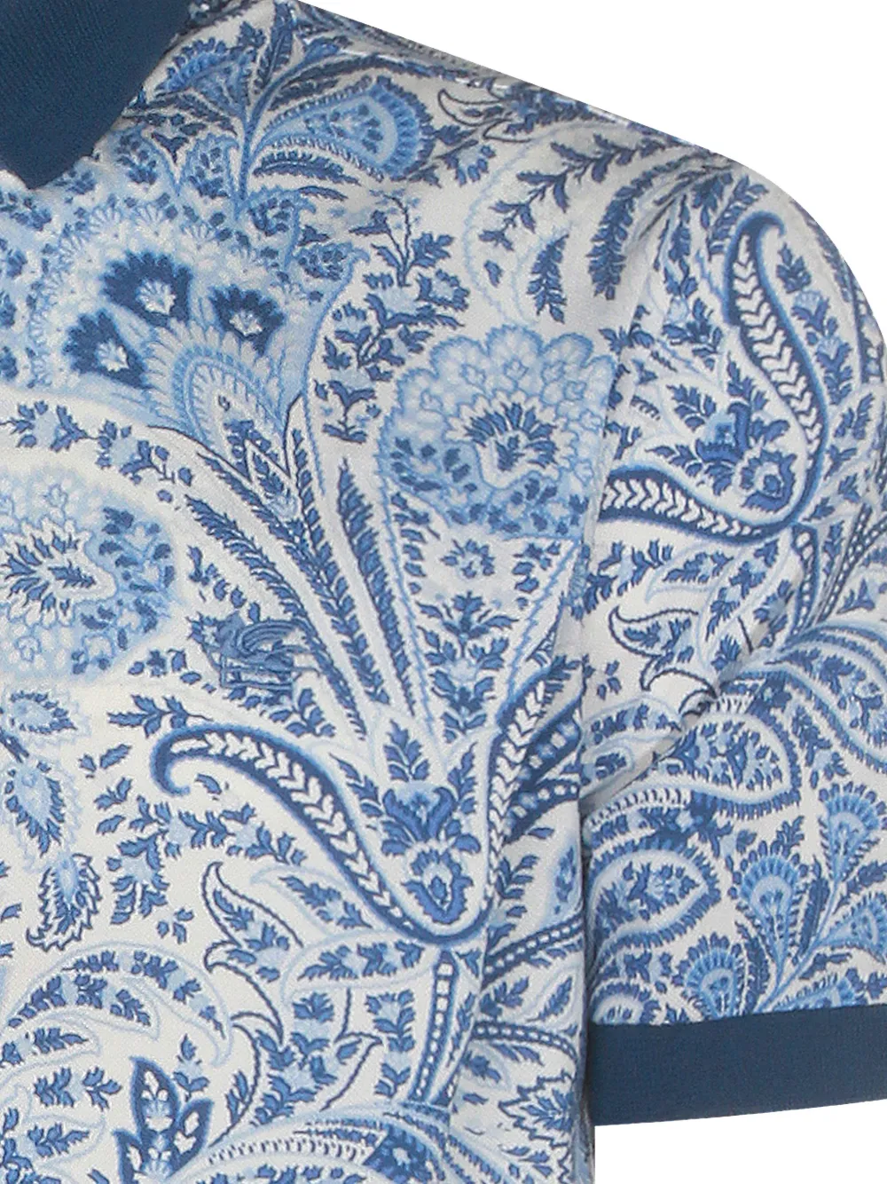 Синий/белый поло с узором "пейсли", воротник-поло, короткие рукава, контрастная отделка, прямой край