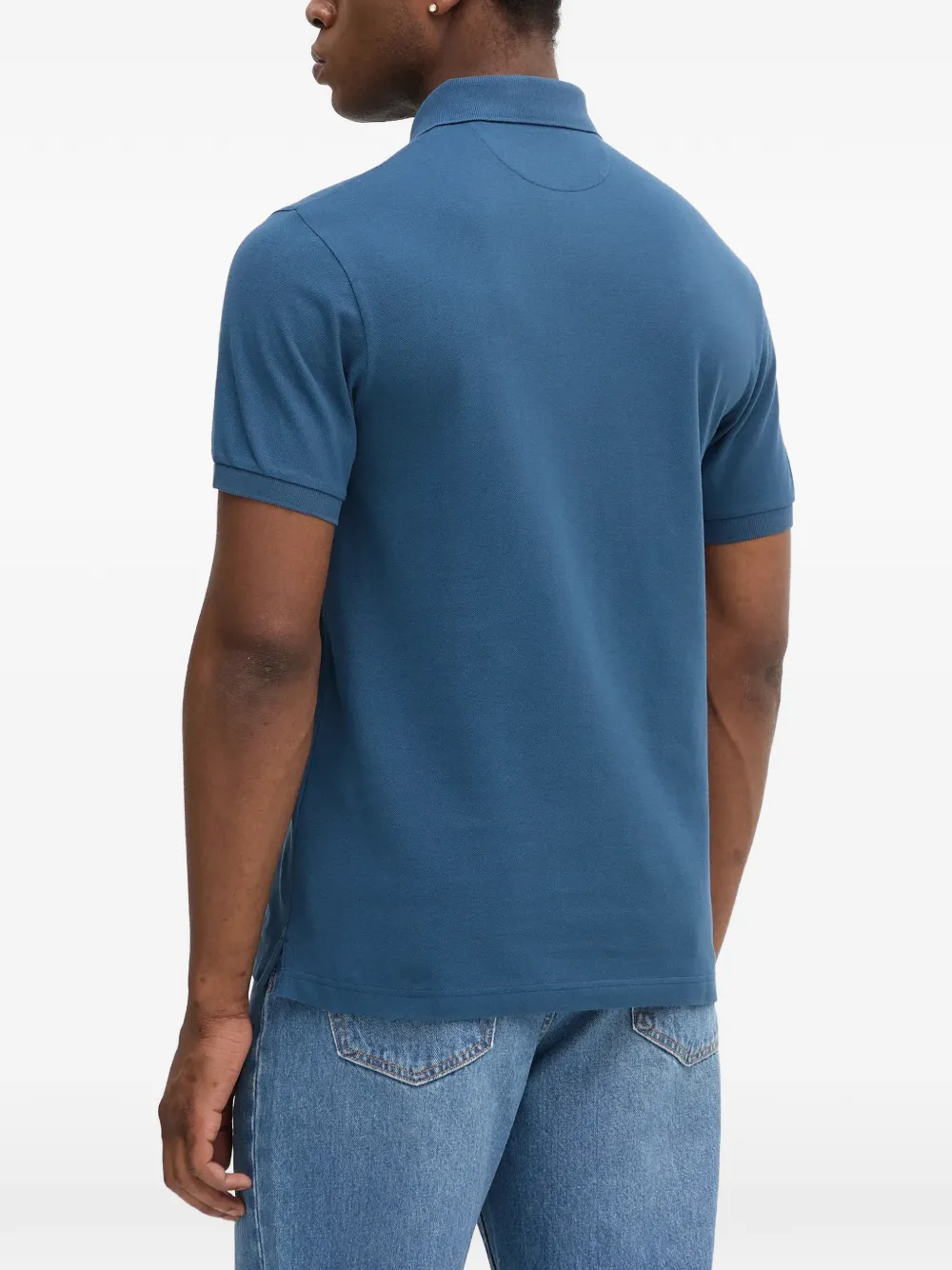 Синее поло с вышитым логотипом, короткими рукавами, застежкой на пуговицы и воротником поло