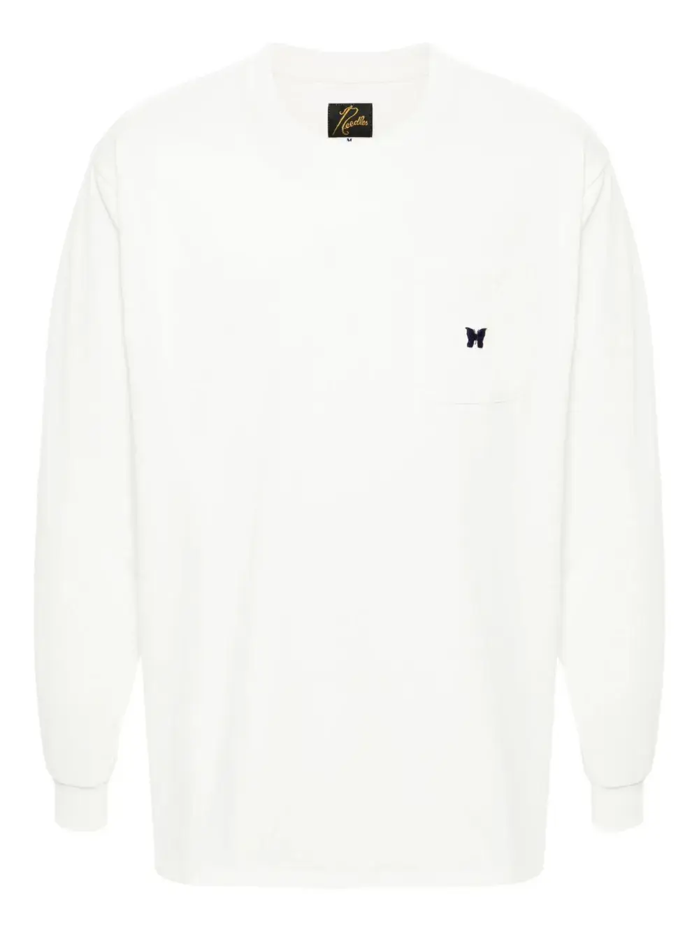Белая футболка с нашитым карманом на груди, вышитым логотипом, длинными рукавами и круглым вырезом