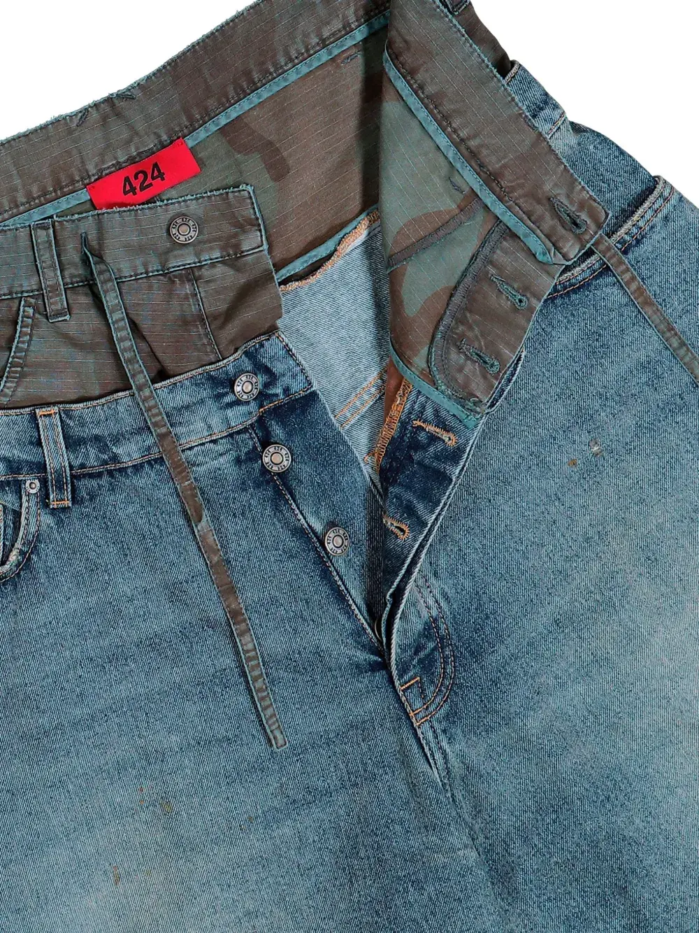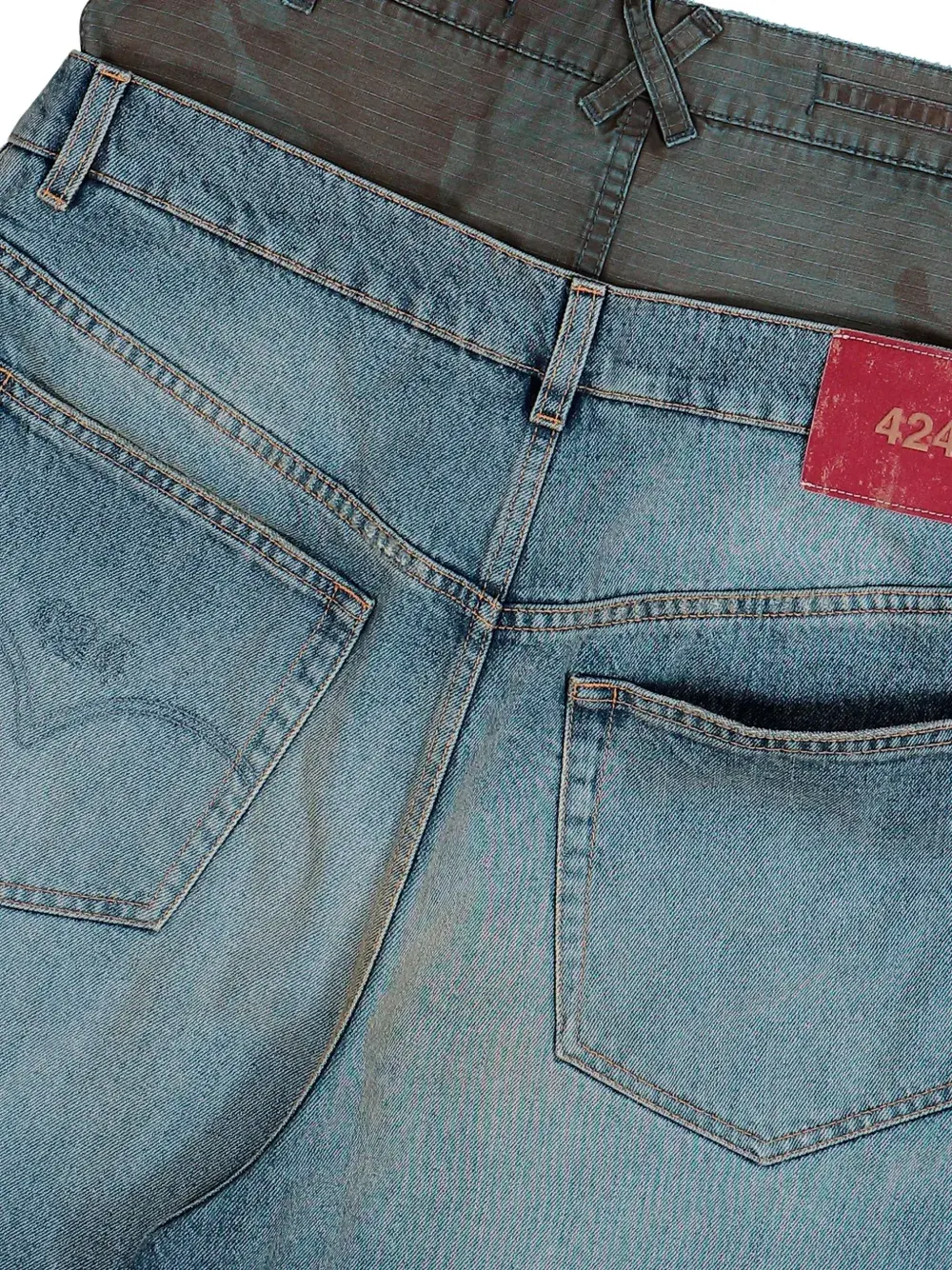 Синий цвет, двухслойный дизайн, свободный крой, необработанный край, пять карманов, шлевки для ремня