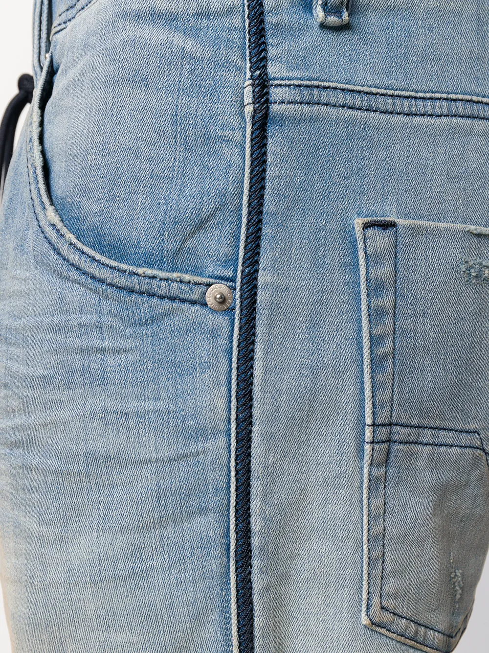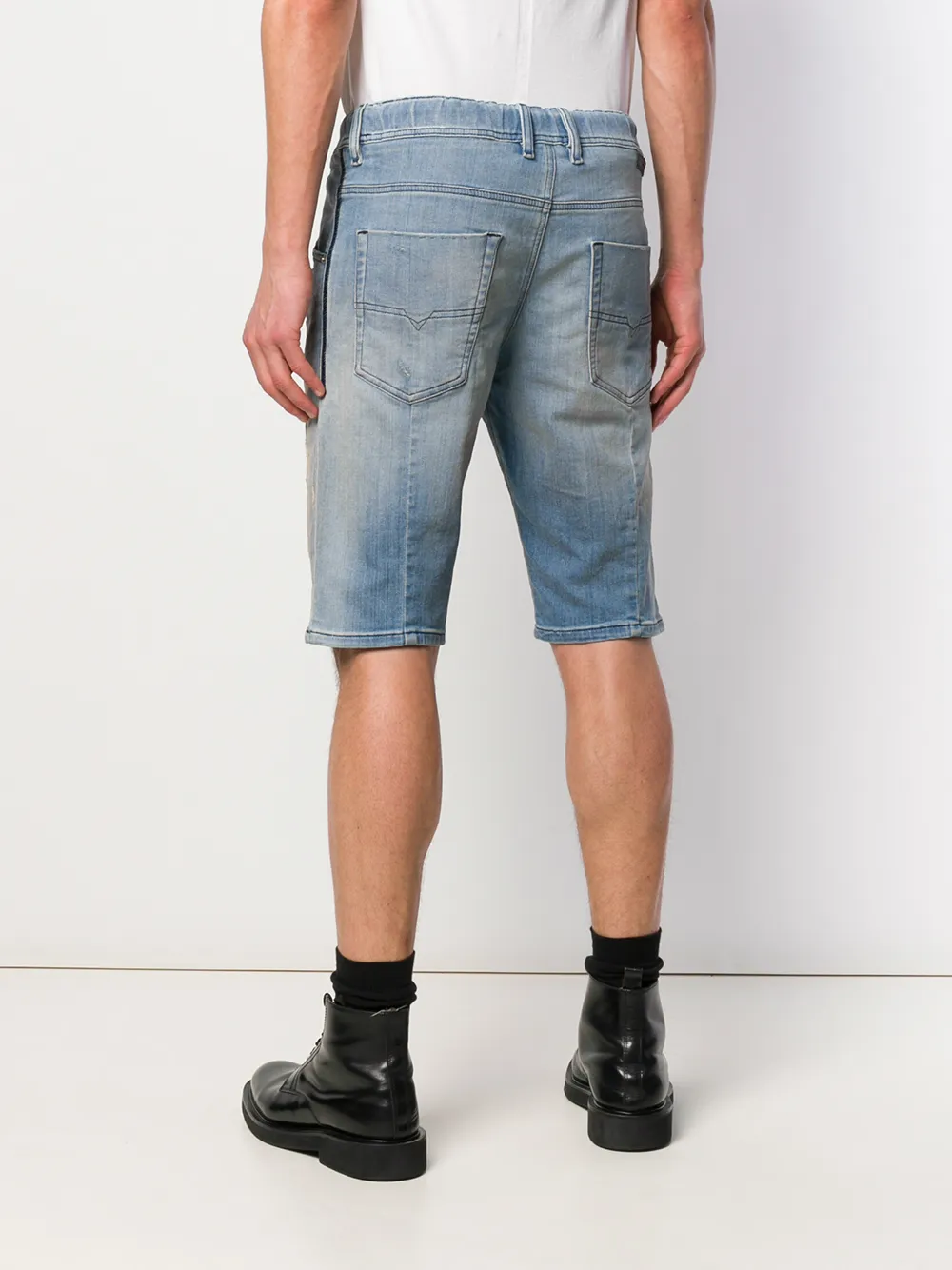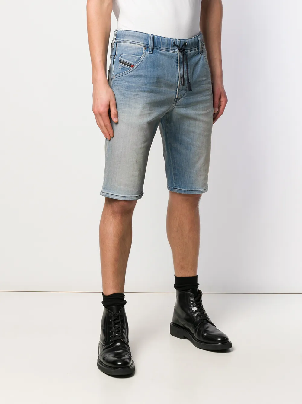 Выбеленные шорты стандартного кроя от Diesel (Дизель). Выцветший эффект, пояс с петлями для ремня, классическая пятикарманная модель и эластичный пояс со шнурком.