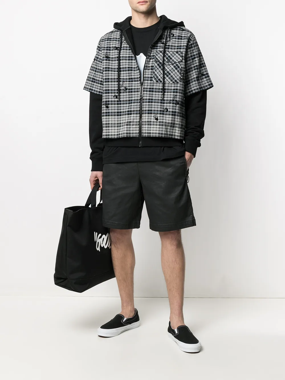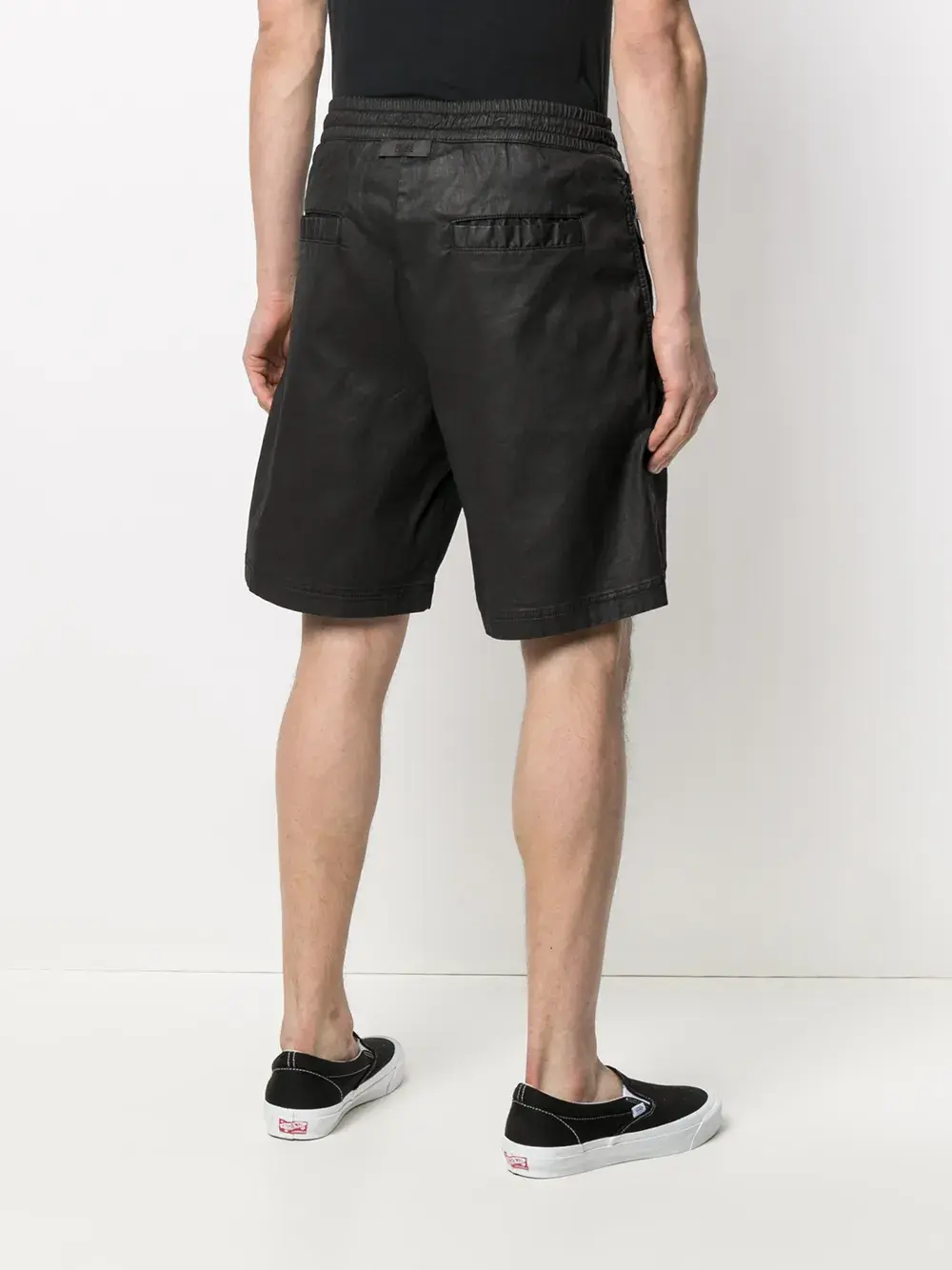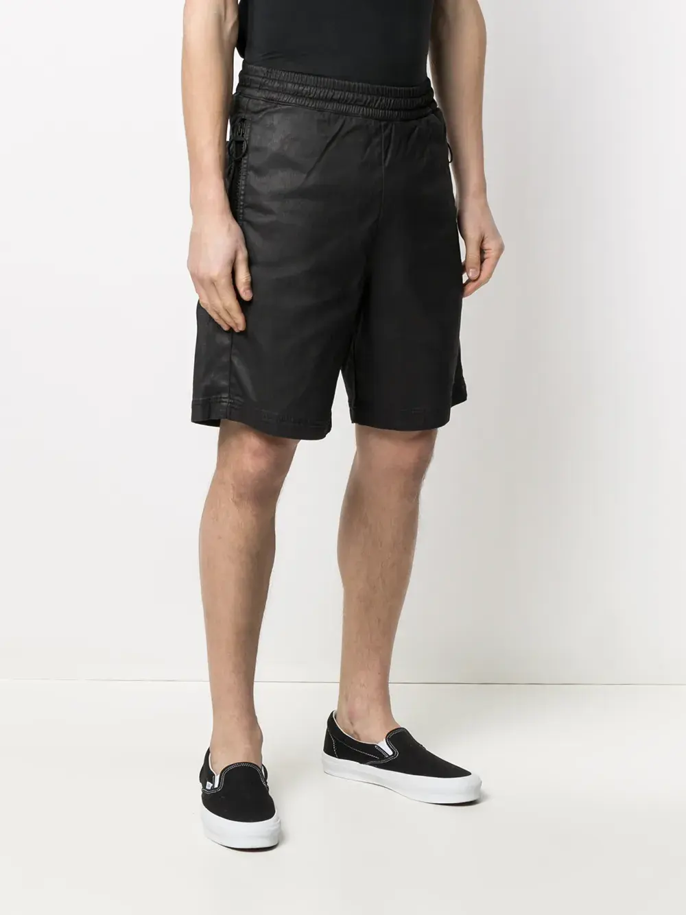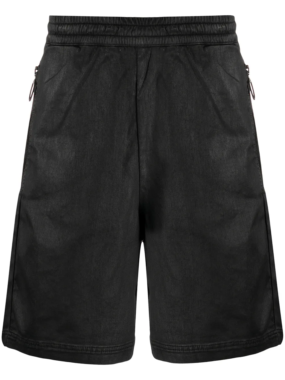 Материал с покрытием, эластичный пояс, два кармана на молнии по бокам и длина по колено.