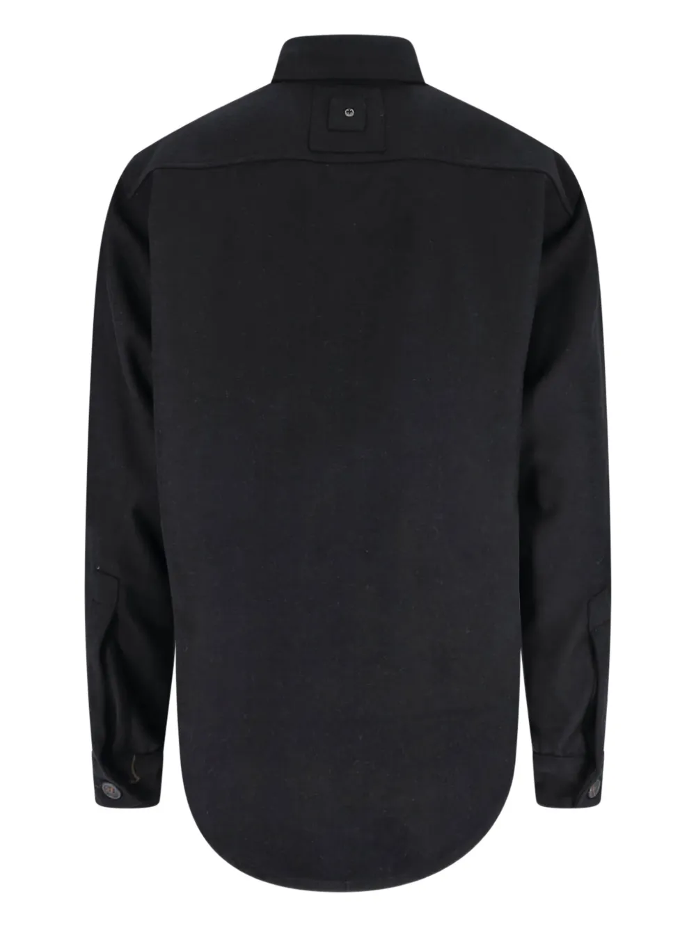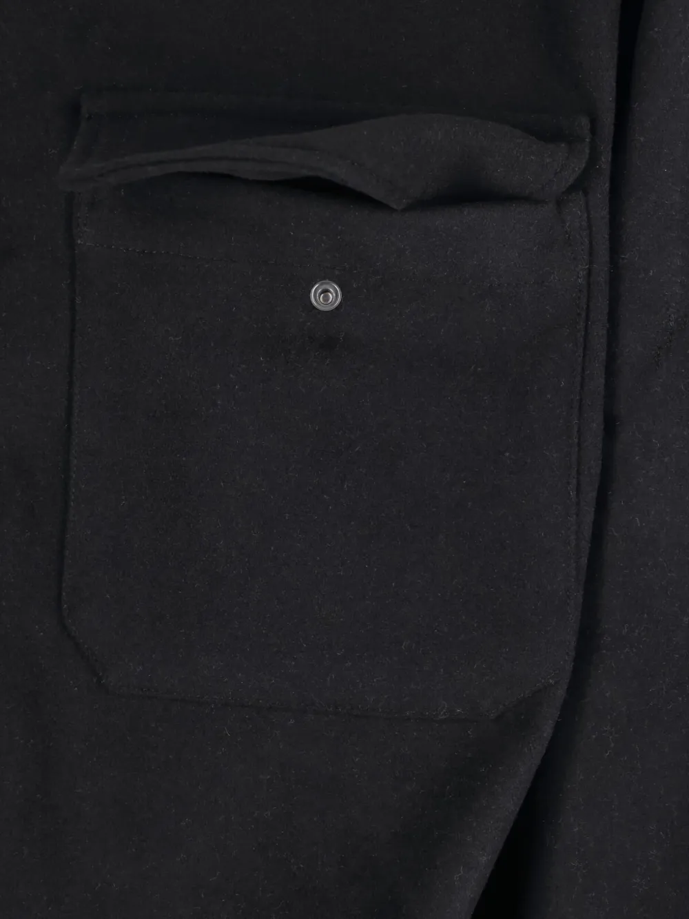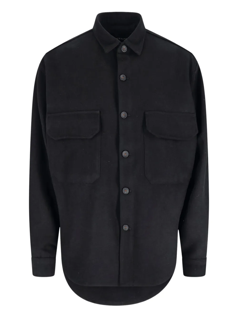 Черные нагрудные карманы, застежка на пуговицы, длинные рукава, манжеты на пуговицах, воротник на стойке