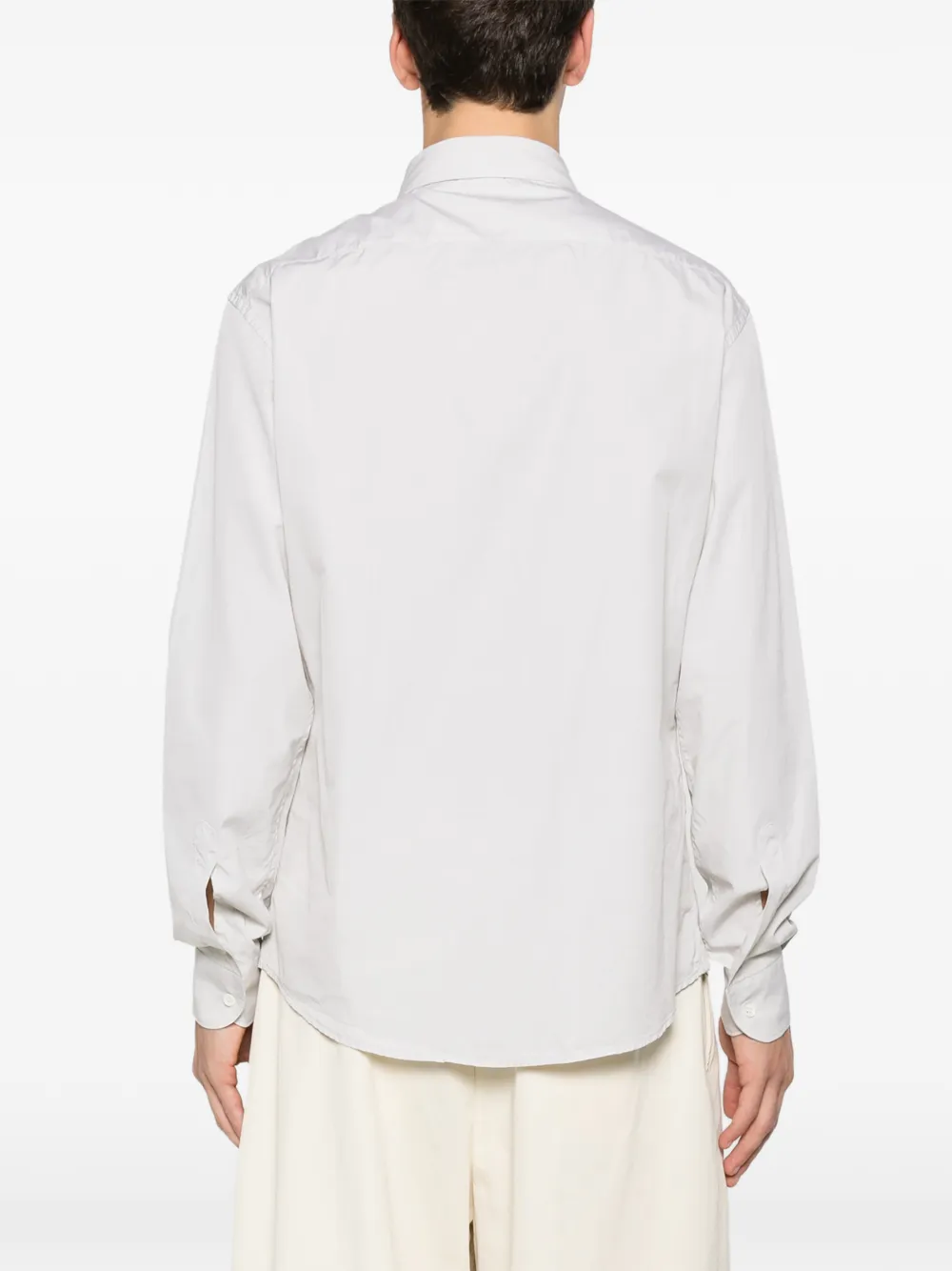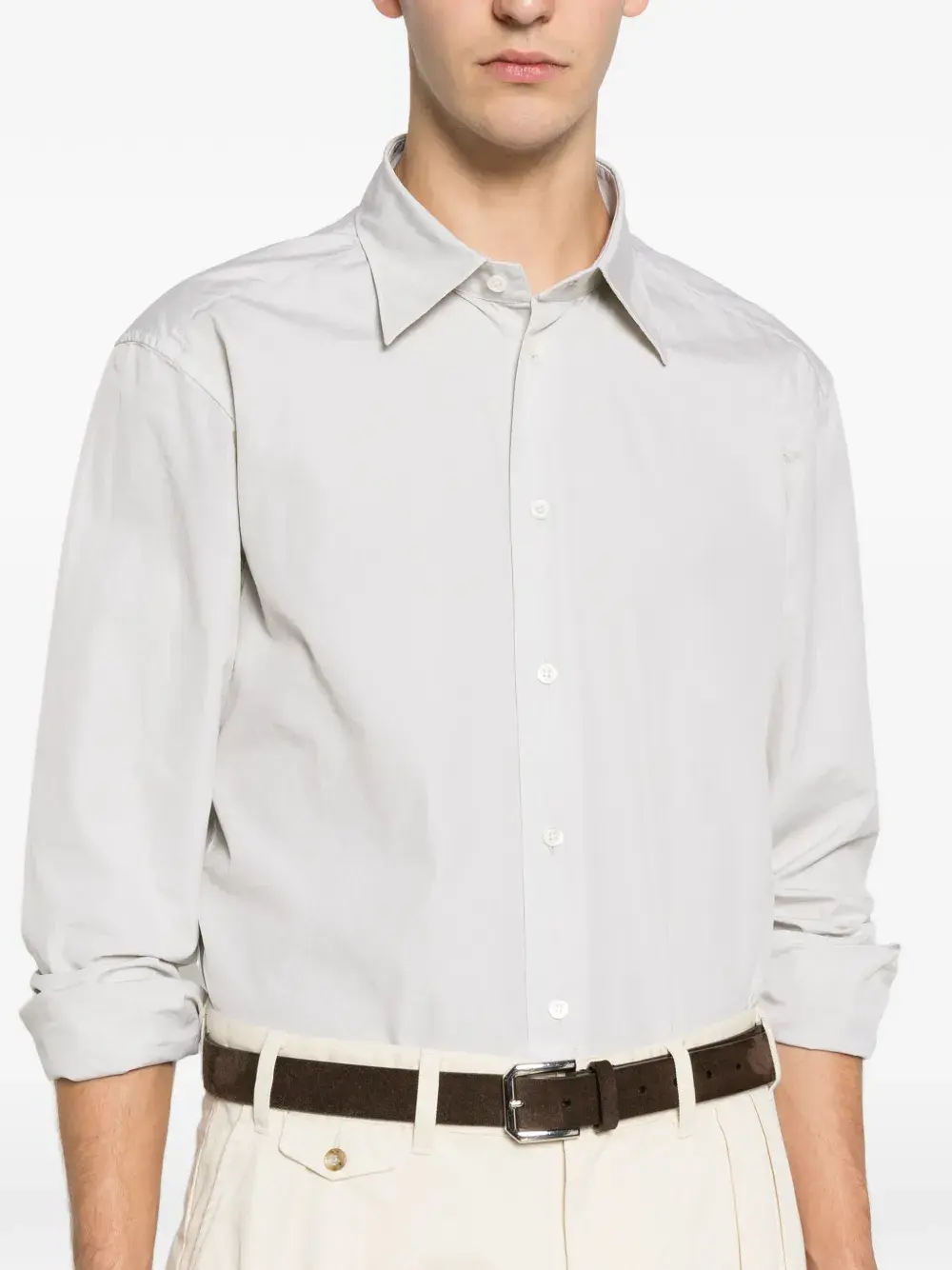 Бежевый, застёжка на пуговицы, длинные рукава, манжеты на пуговицах, заострённый воротник