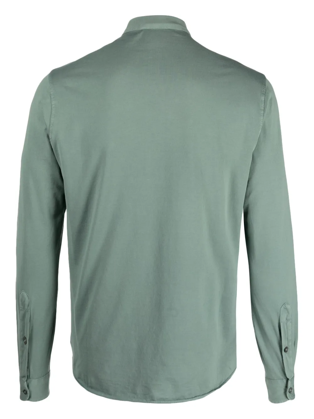 Зеленый, хлопок, воротник-стойка, длинные рукава, манжеты на пуговицах, планка на пуговицах спереди и закругленный подол сзади.