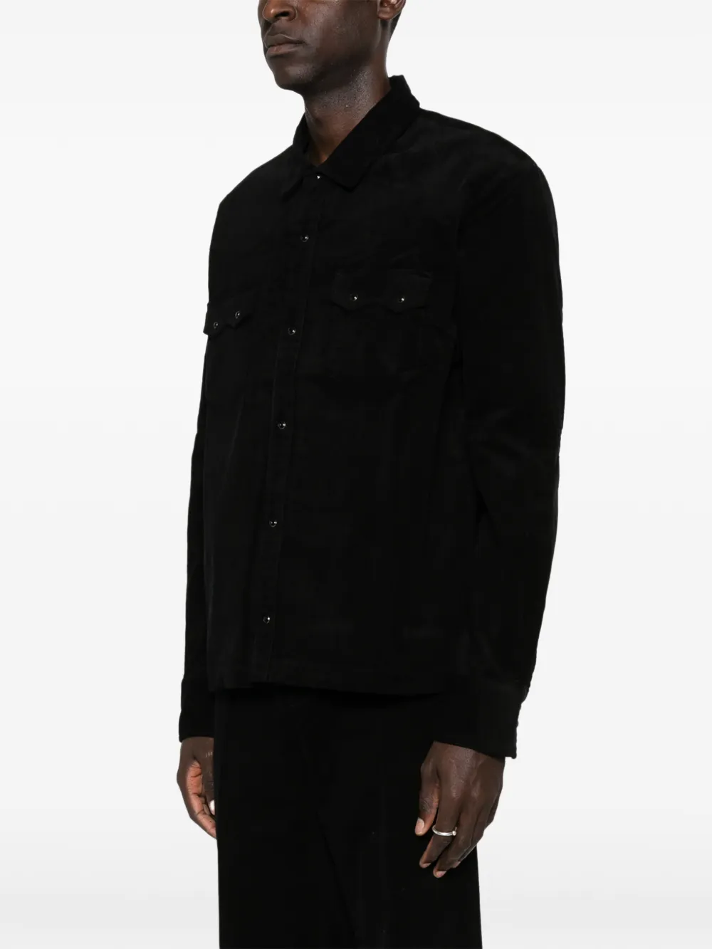 Чёрный цвет, застёжка на пуговицы, два нагрудных кармана, длинные рукава, манжеты на пуговицах, трикотажная/вельветовая фактура