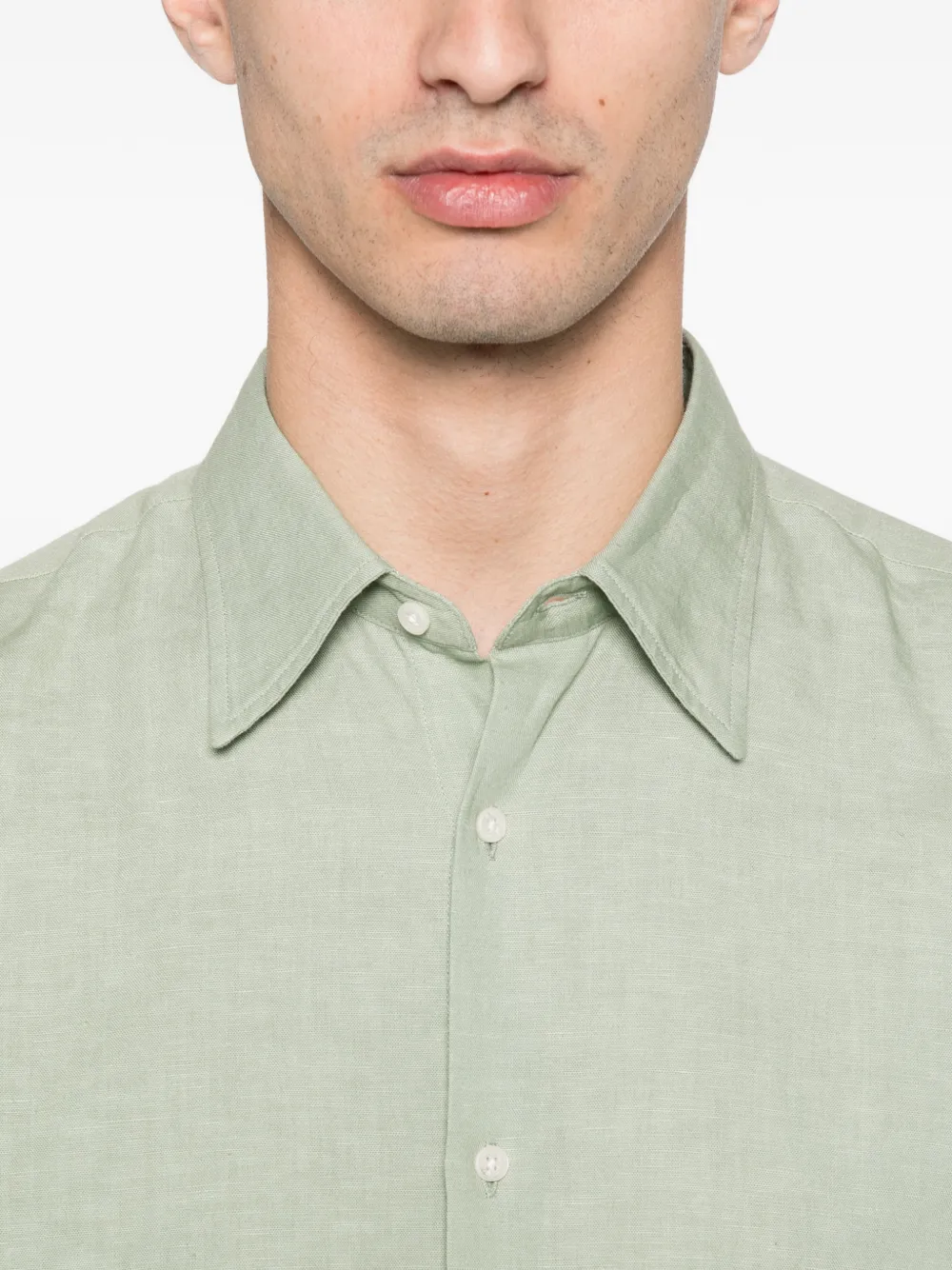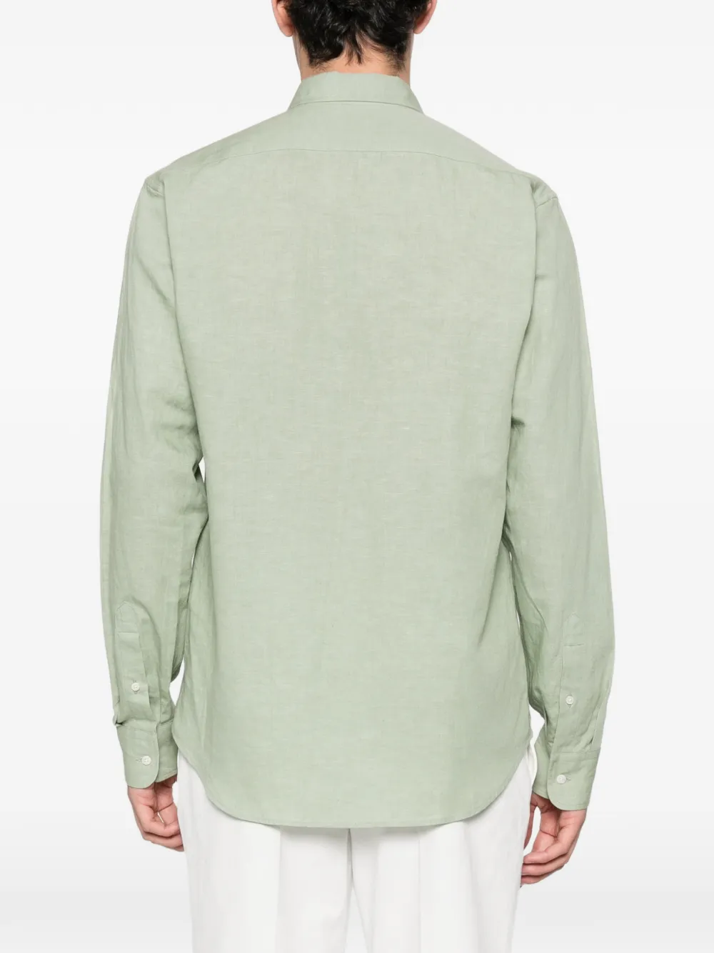 Шалфейно-зеленая рубашка из смеси хлопка и льна с длинными рукавами, застежкой на пуговицы и отложным воротником