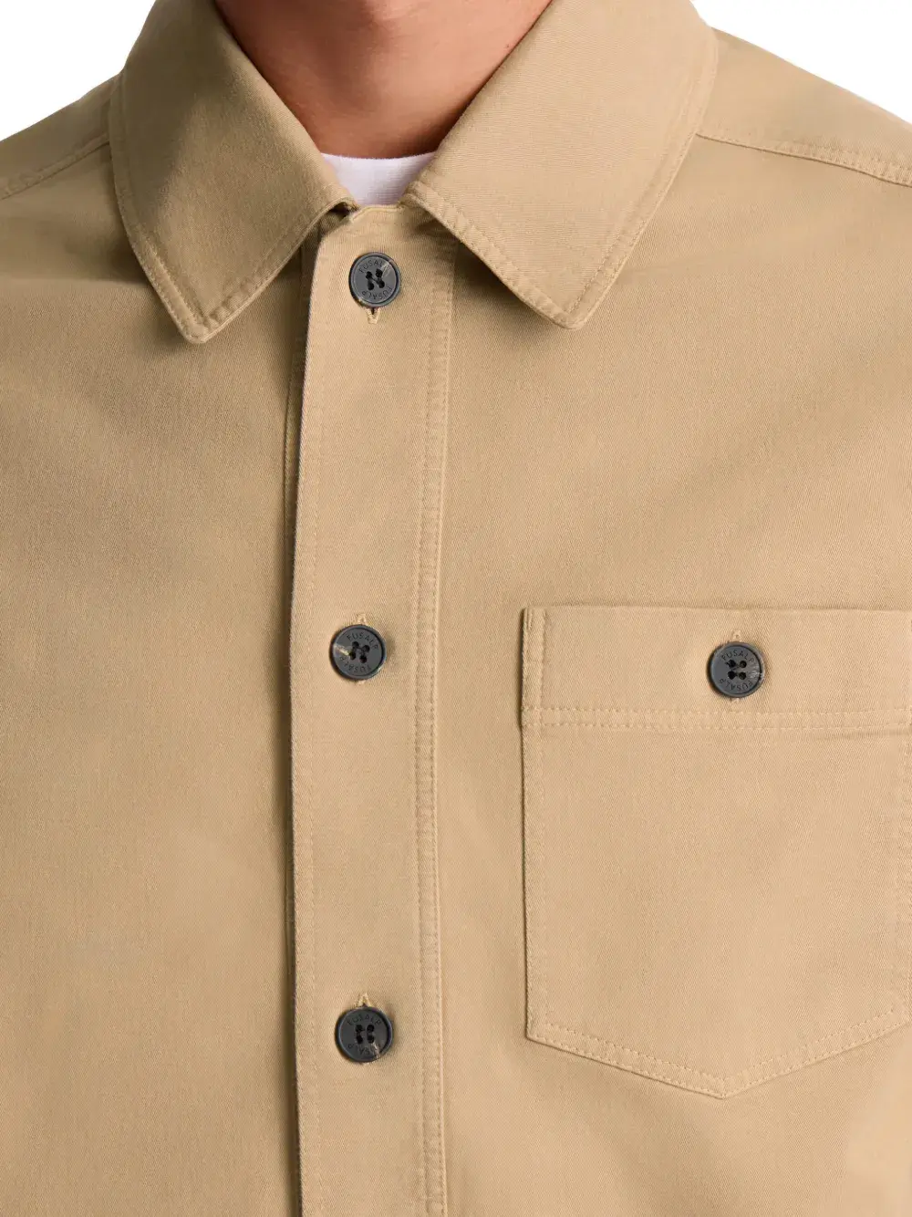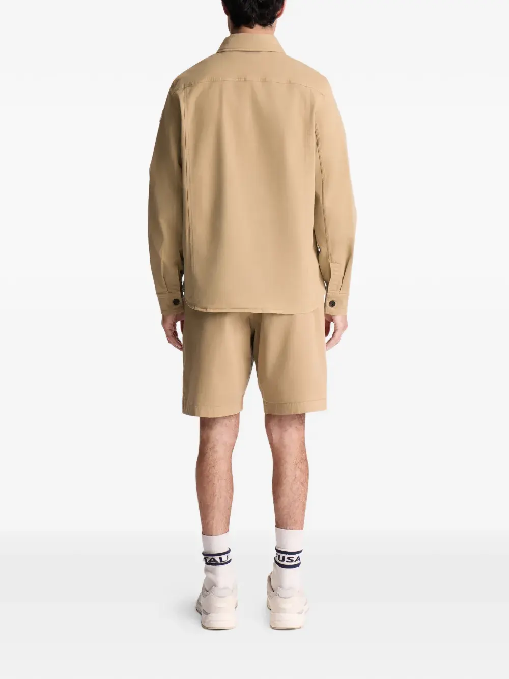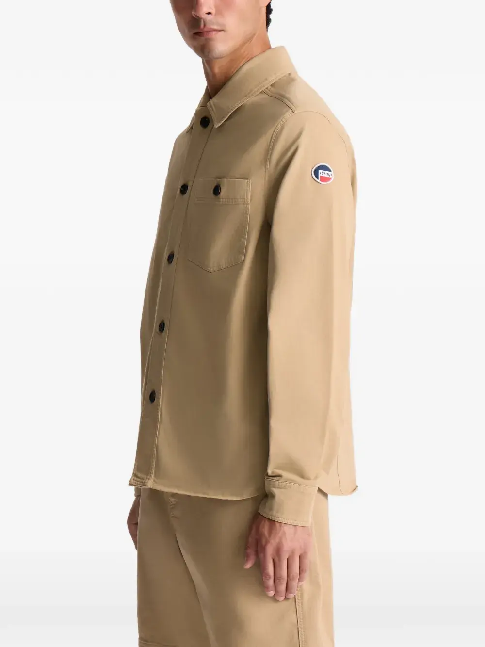 Песочно-бежевый цвет, застёжка на пуговицы, нагрудный карман, манжеты на пуговицах, нашивка с логотипом