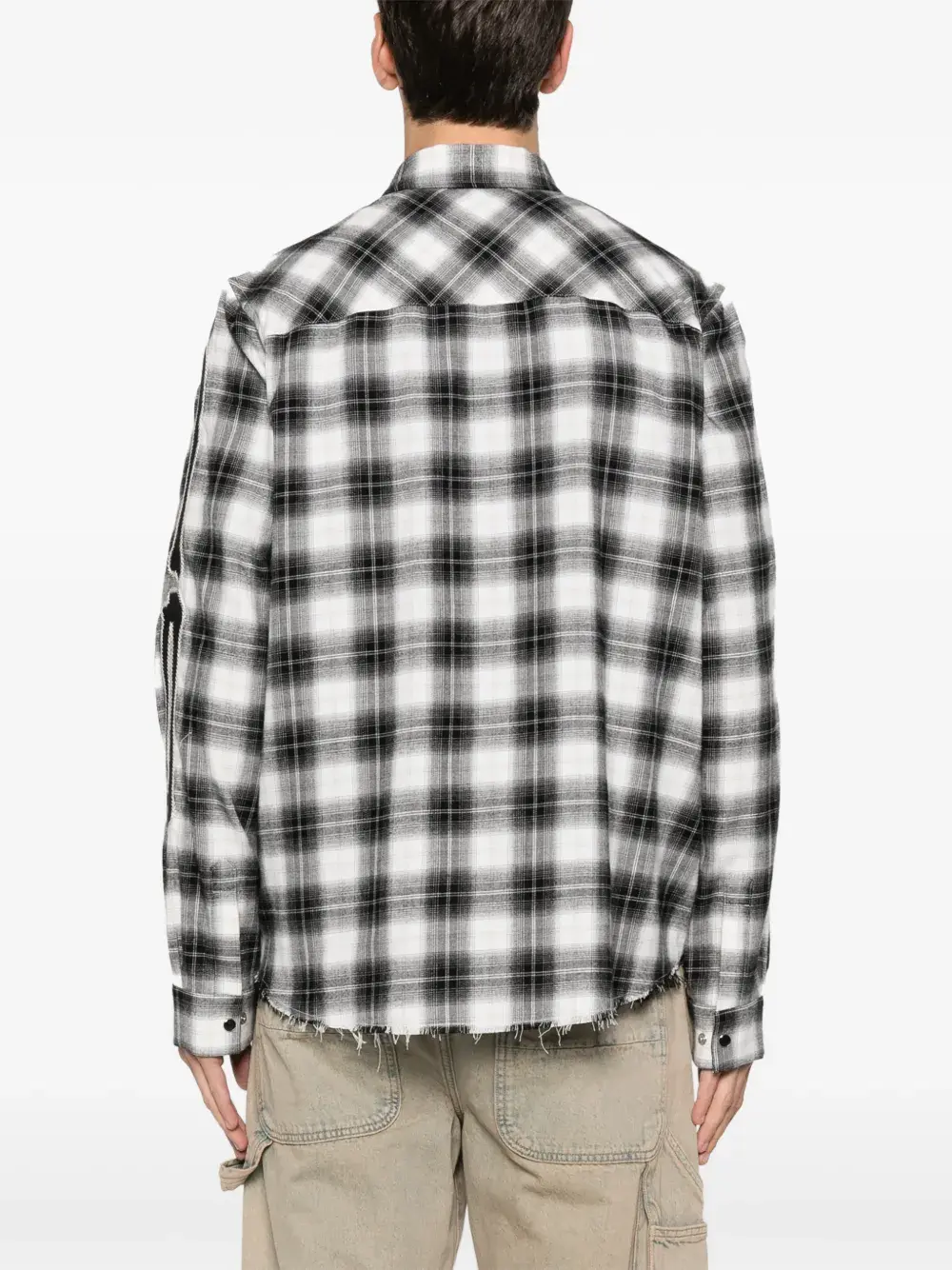 Чёрная рубашка в клетку с бахромой по краю, нагрудными карманами, длинными рукавами и застёжкой на пуговицы