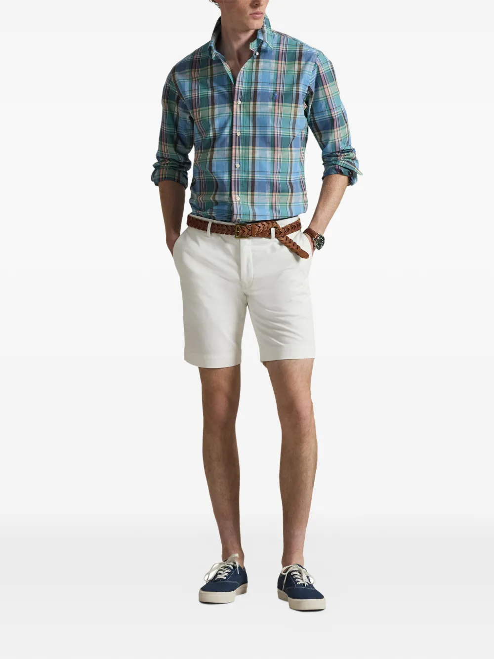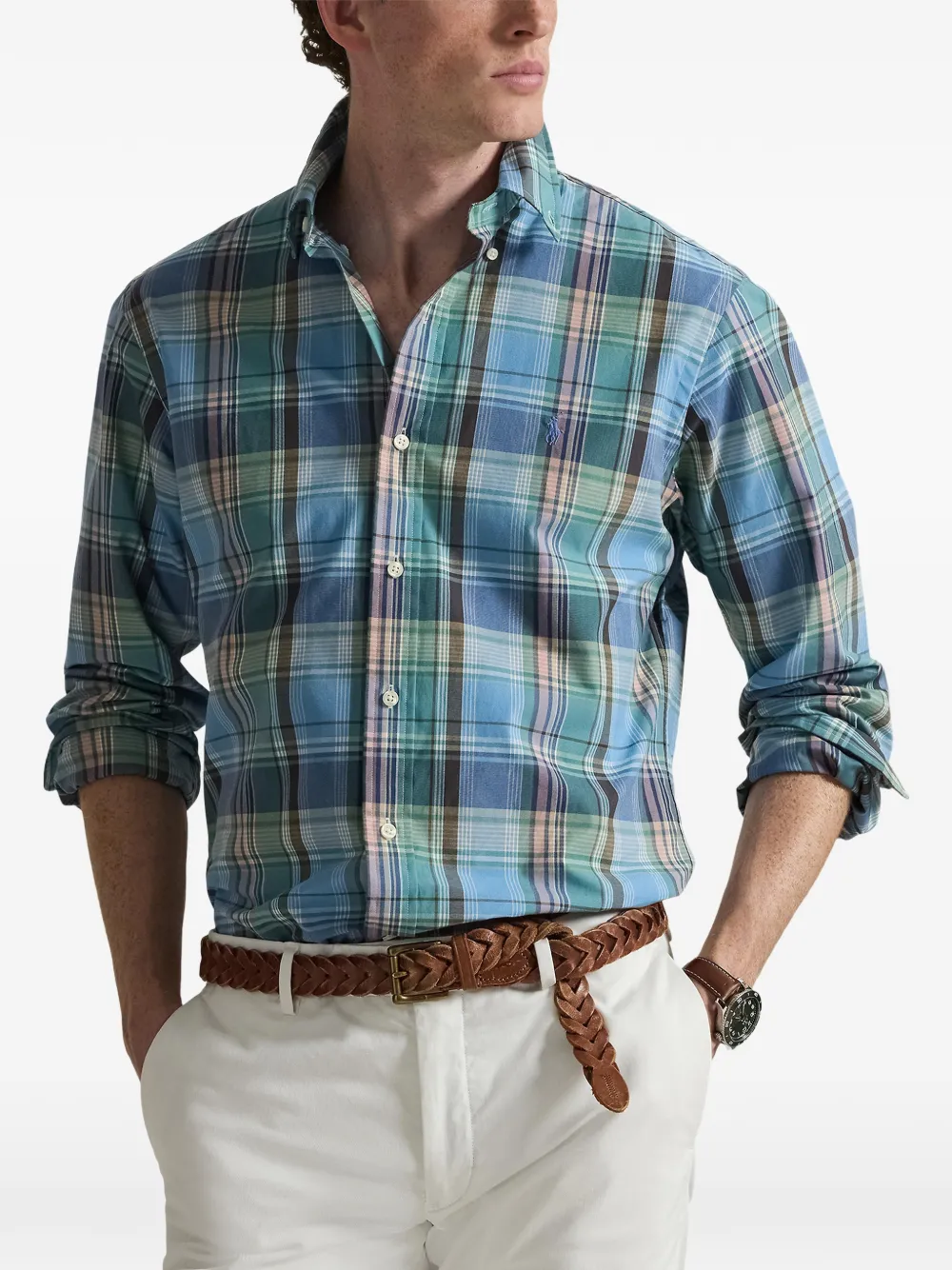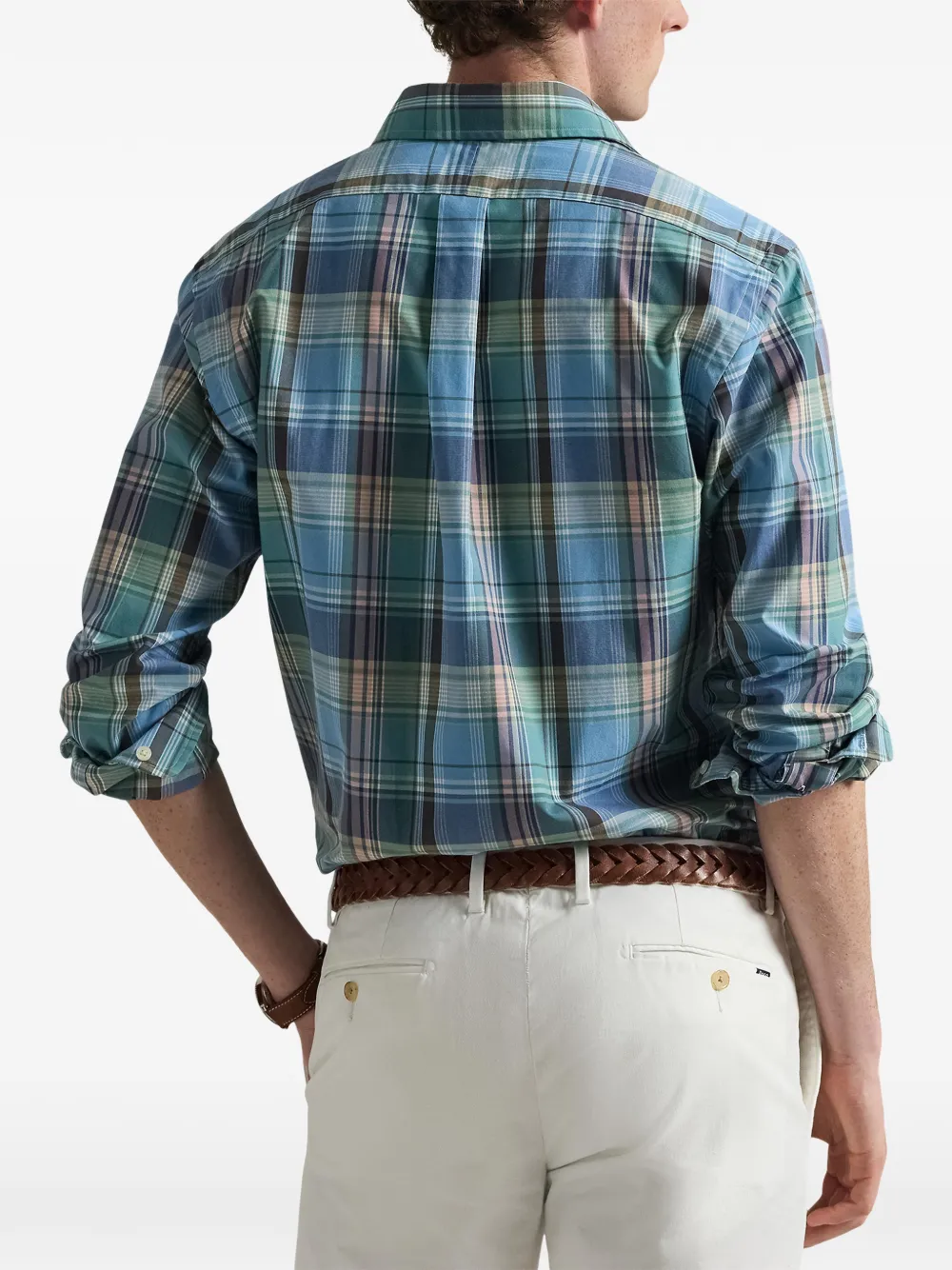Синий и зелёный клетчатый узор, длинные рукава, застёжка на пуговицы спереди, воротник на пуговицах, манжеты на пуговицах
