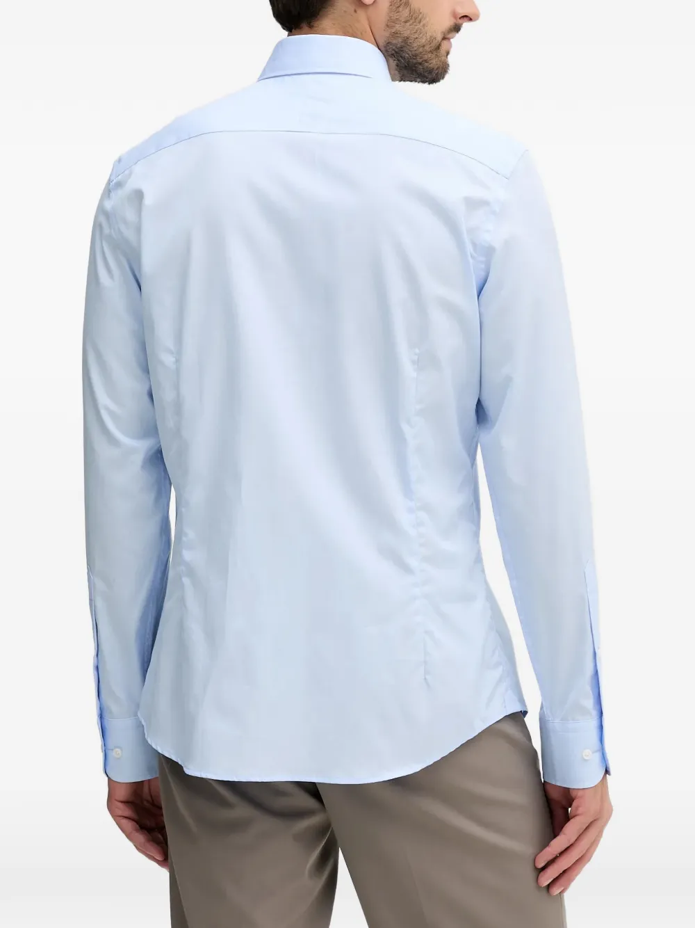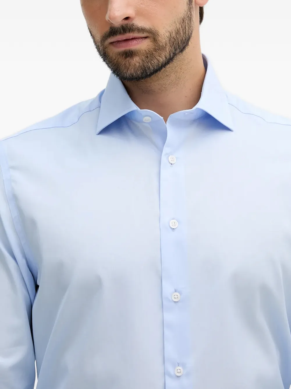 Светло-голубая рубашка с застежкой на пуговицы, длинными рукавами и классическим воротником