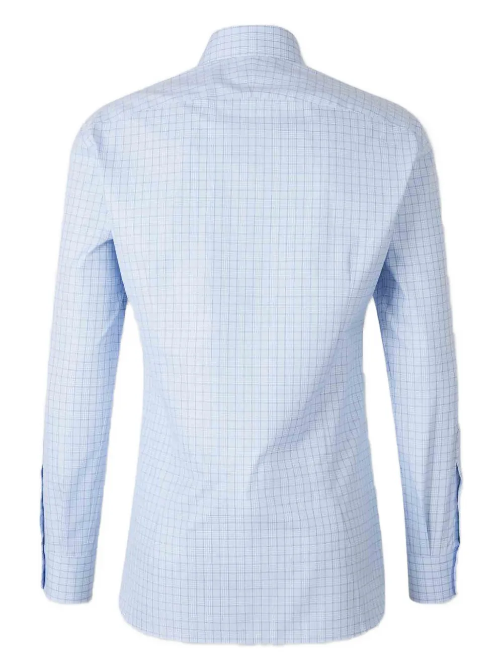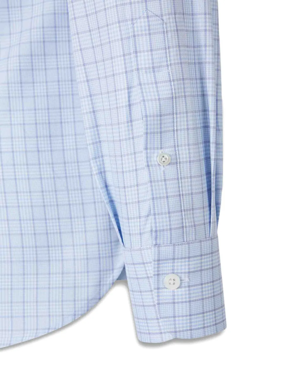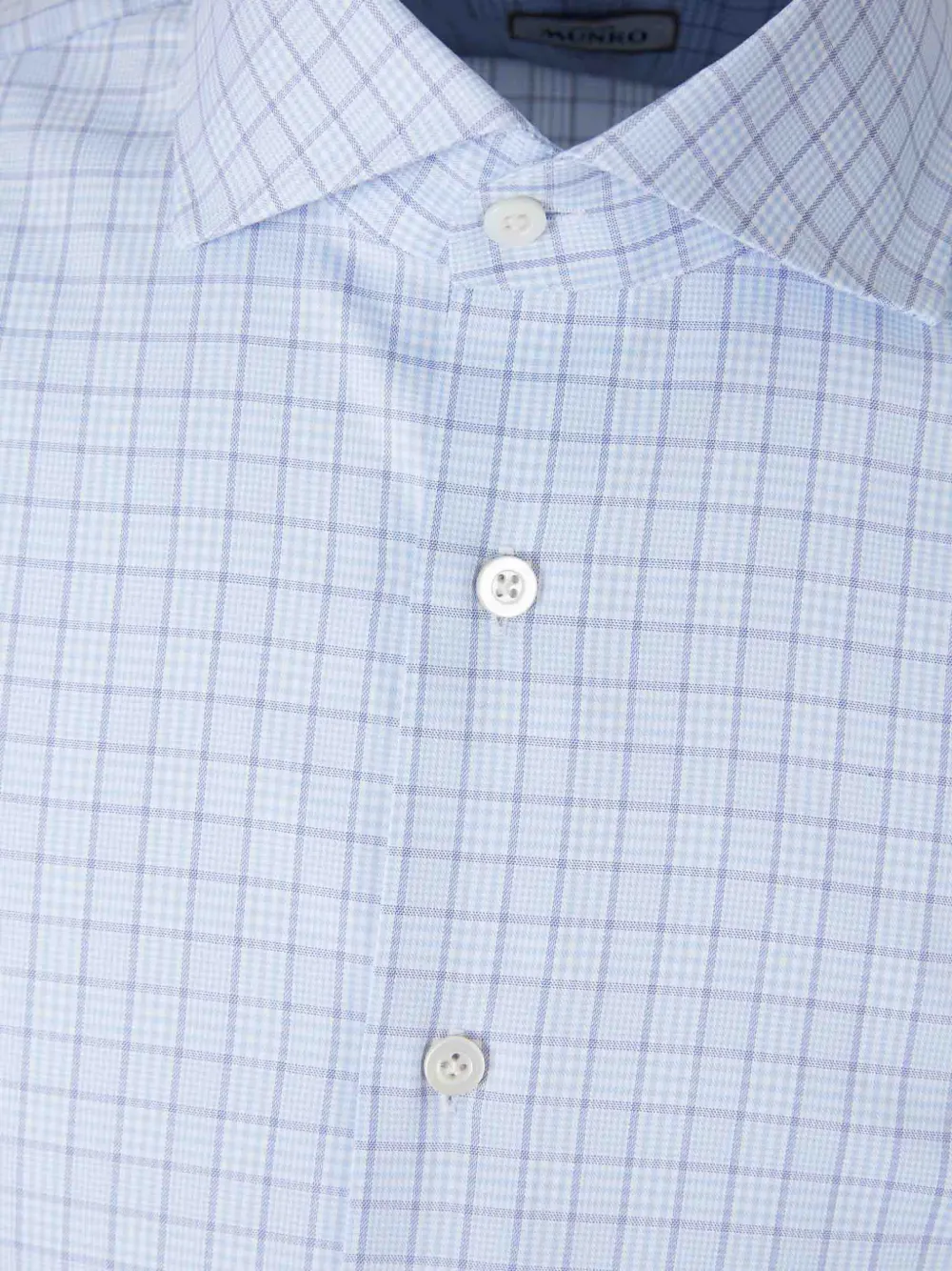Белый с клетчатым узором, воротник на пуговицах, манжеты на пуговицах, застежка на пуговицы спереди, тонкая прострочка