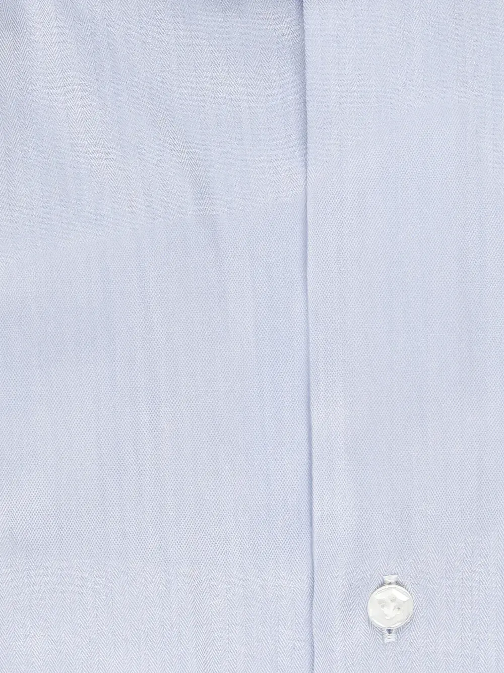 Светло-голубая застёжка на пуговицы, длинные рукава, манжеты на пуговицах, отложной воротник, нагрудный карман