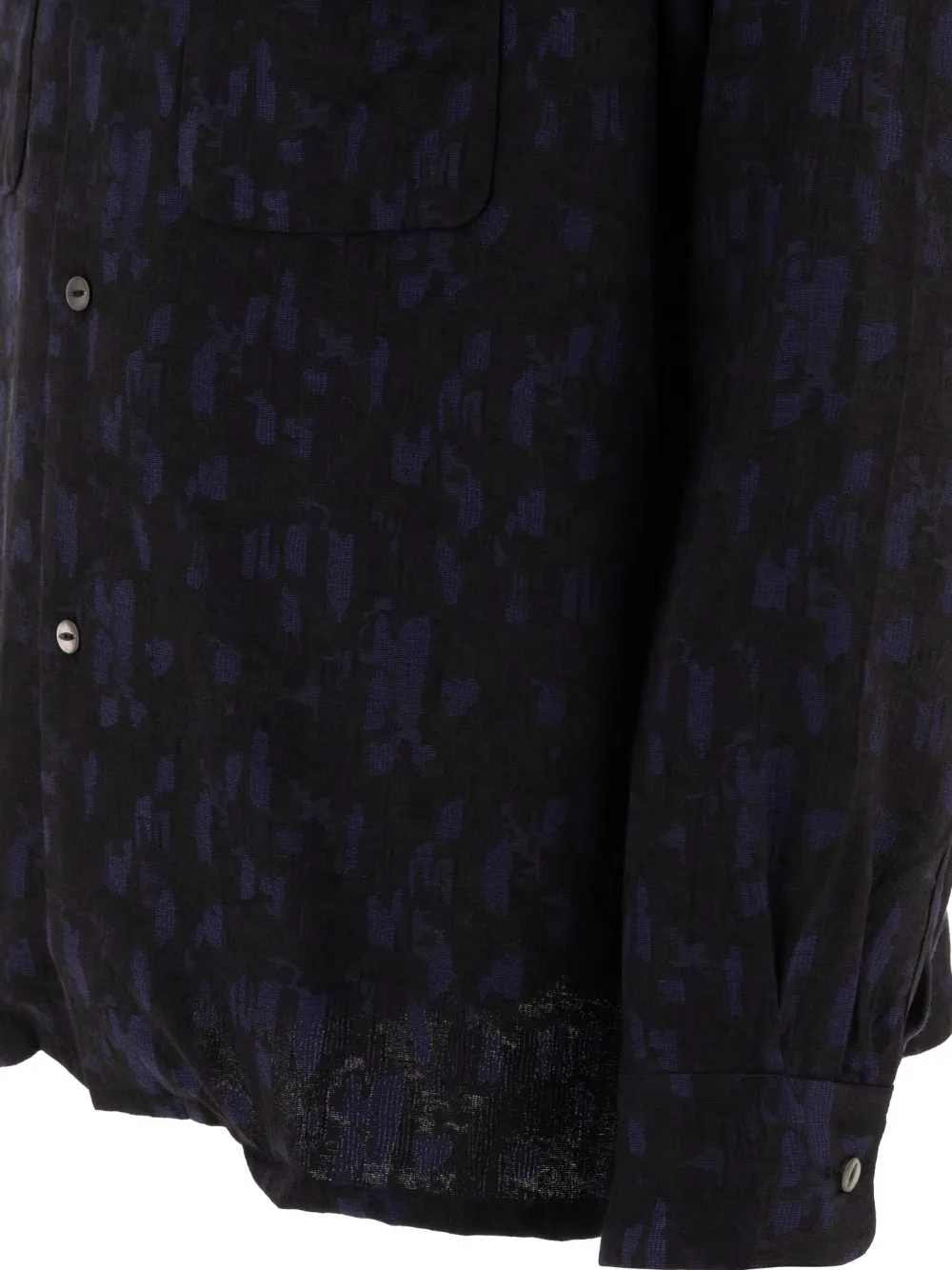 Темно-синяя рубашка с отложным воротником, застёжкой на пуговицы, длинными рукавами и двумя накладными карманами с клапанами
