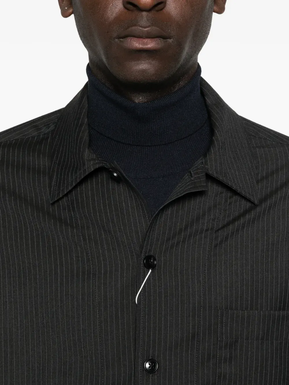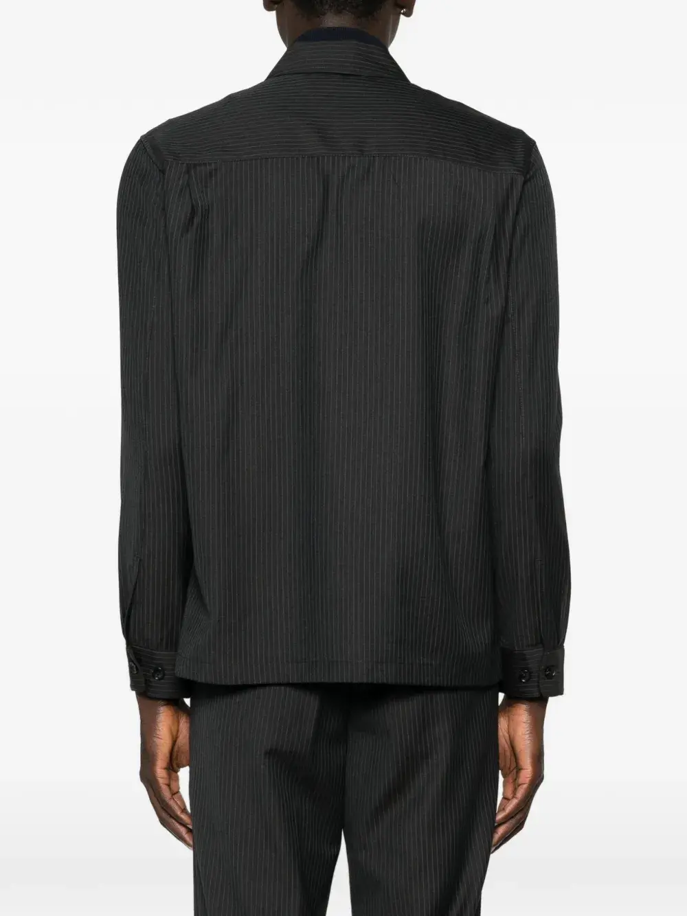 Чёрный с рисунком в тонкую полоску, нагрудный карман, застёжка на пуговицы, длинные рукава, отложной воротник