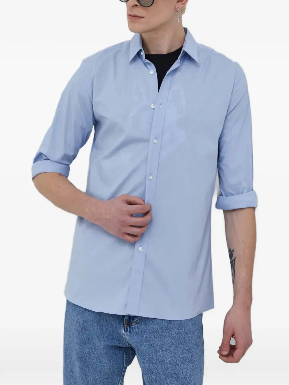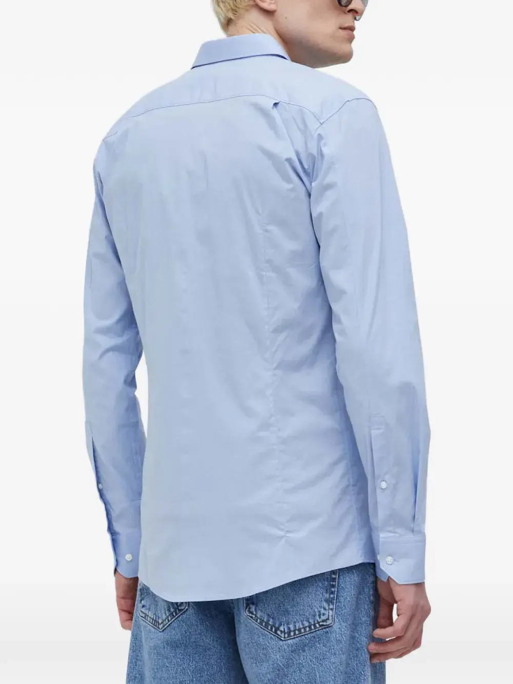 Светло-голубая рубашка с застёжкой на пуговицы, отложным воротником, длинными рукавами и манжетами на пуговицах