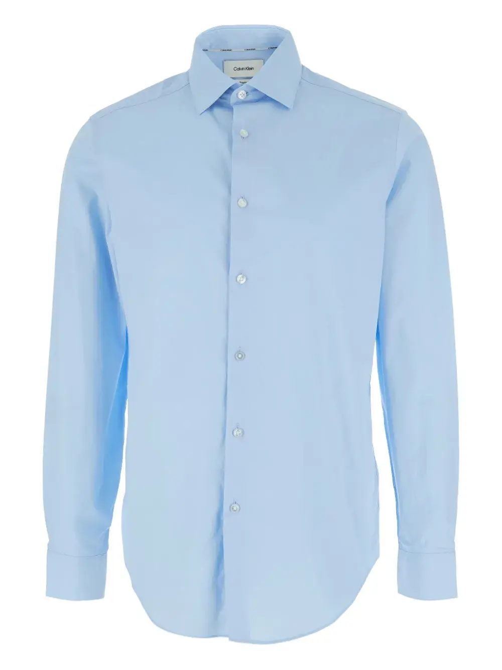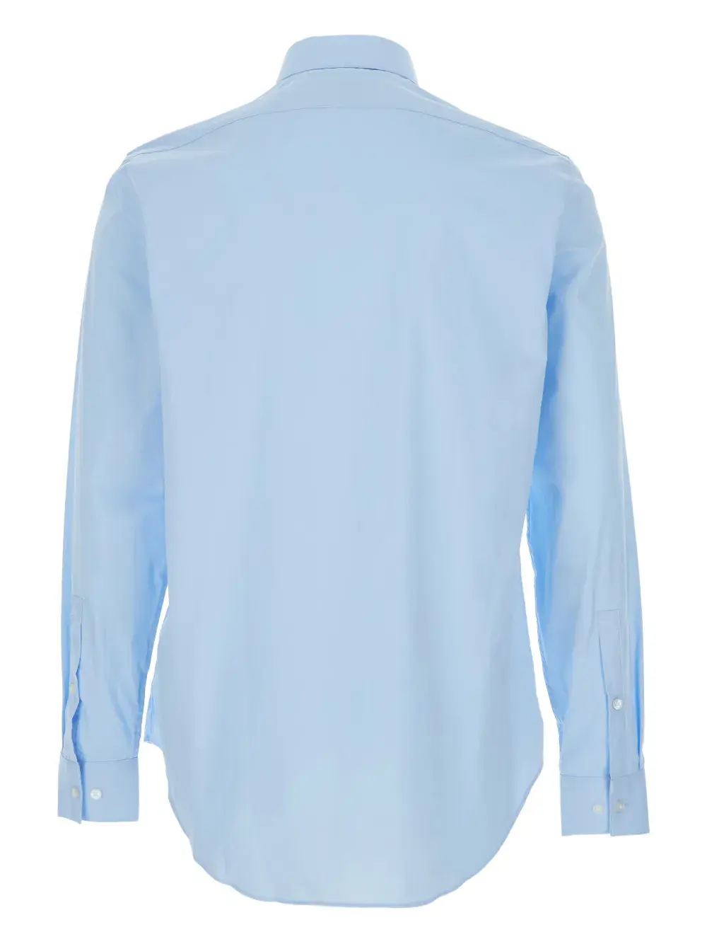 Светло-голубой классический воротник, длинные рукава, застежка на пуговицы спереди, манжеты на пуговицах, закругленный низ