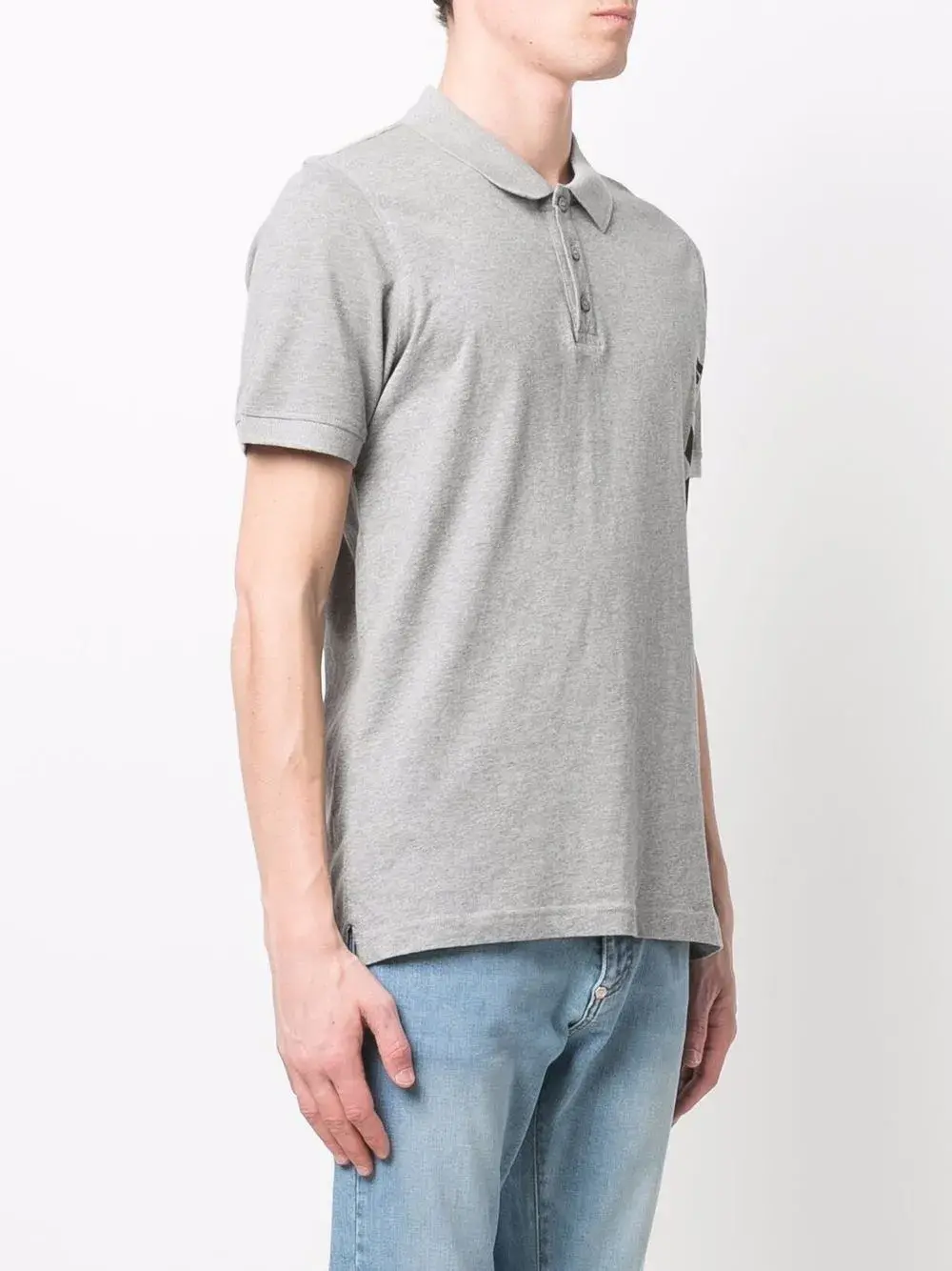 Логотип сбоку, воротник поло и короткие рукава.