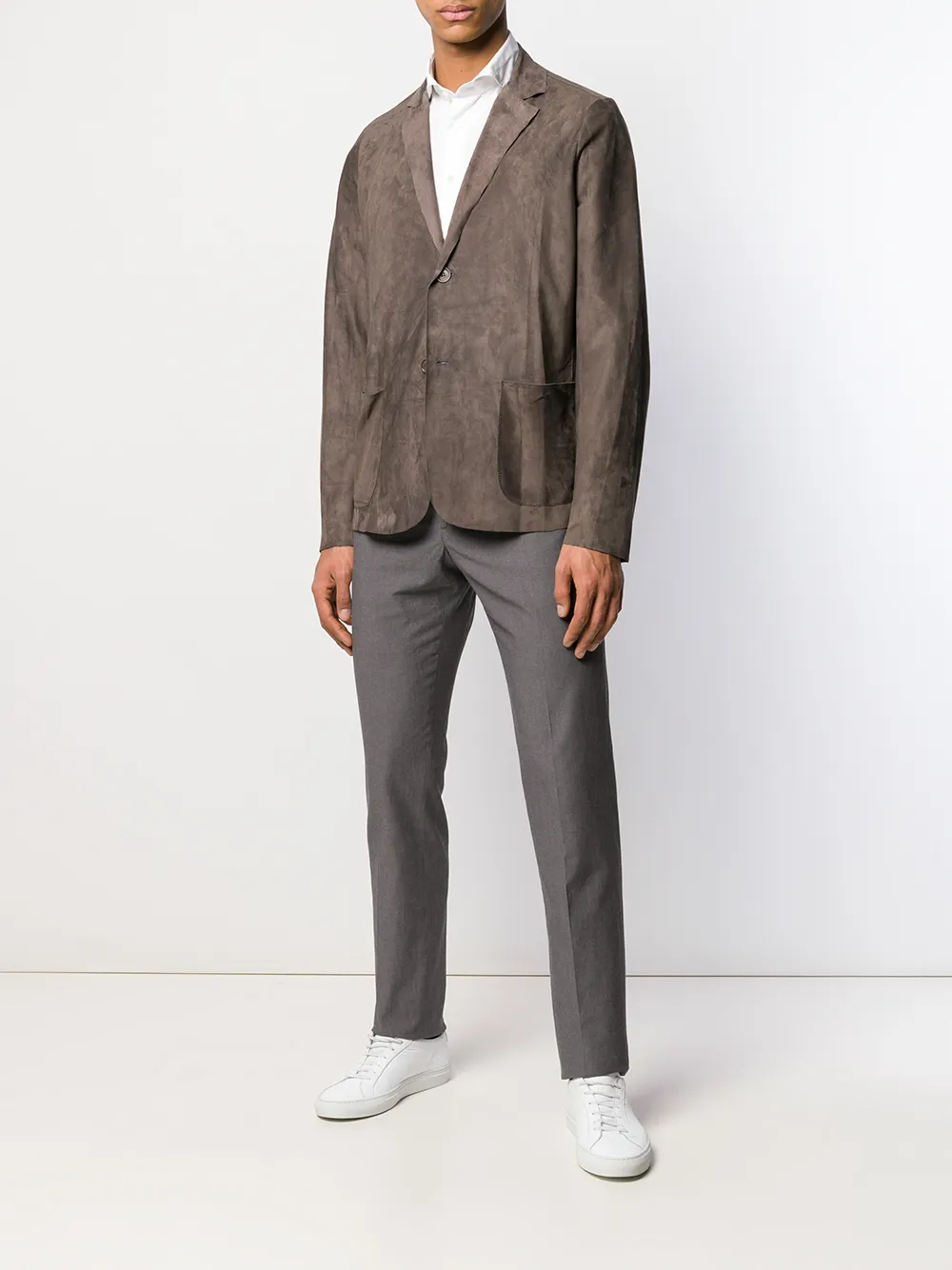 Классический воротник, длинные рукава, застежка на пуговицах спереди, закругленный подол и манжеты на пуговицах.