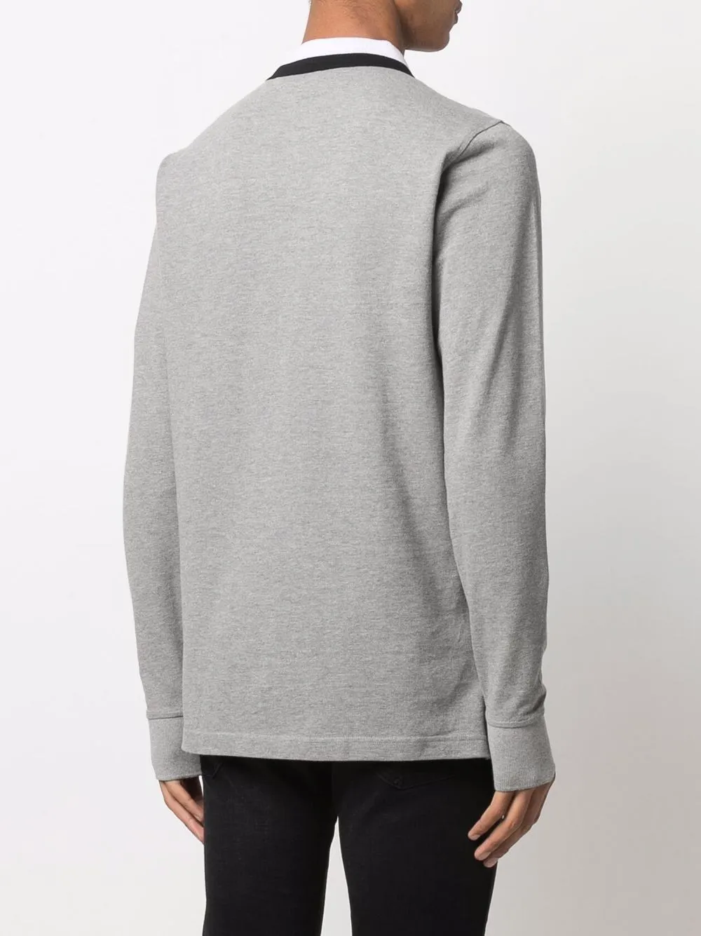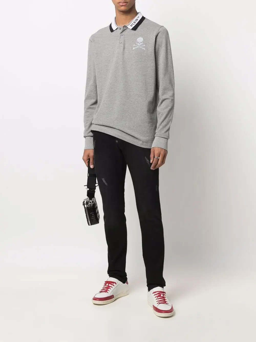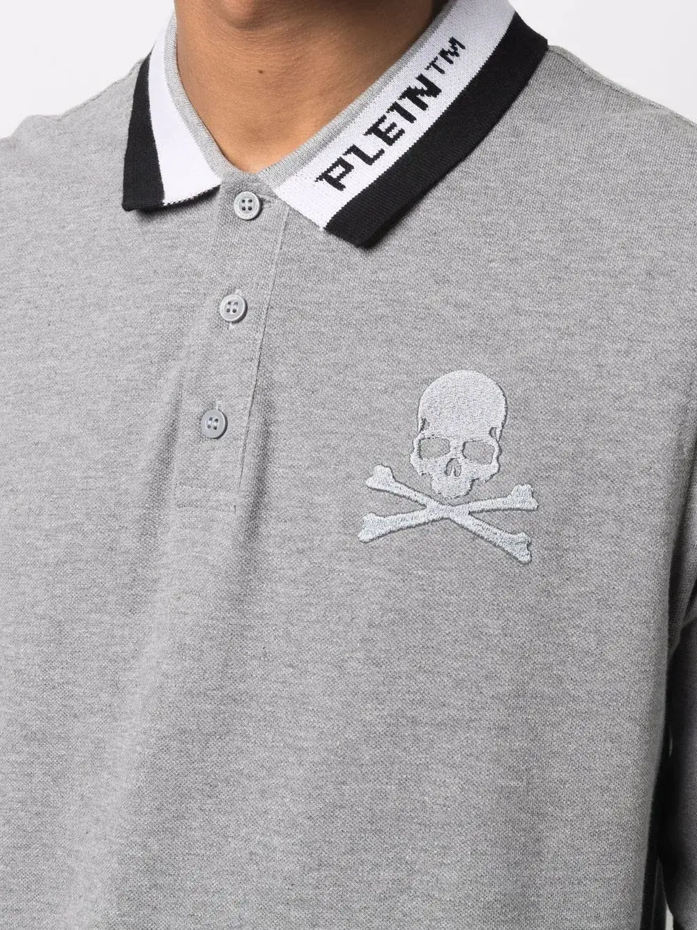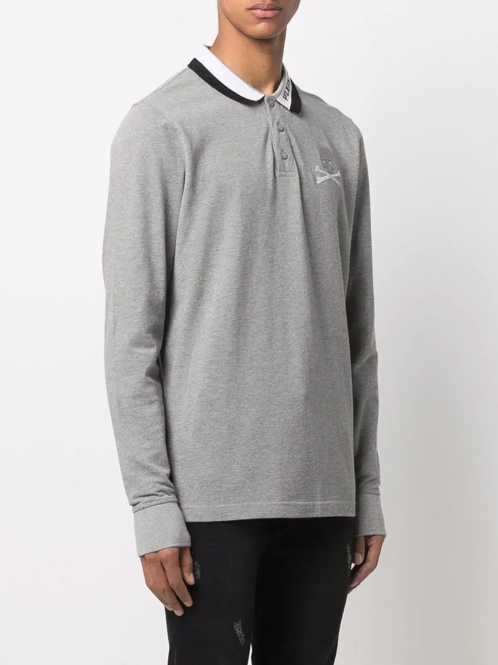Принт с изображением черепа, логотип спереди, воротник поло и длинные рукава.
