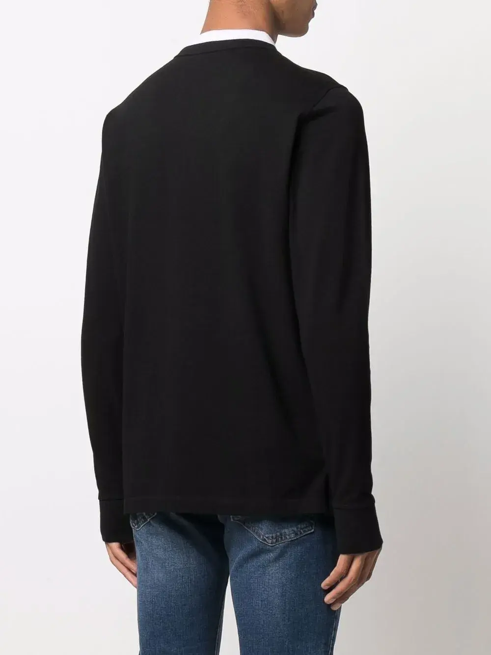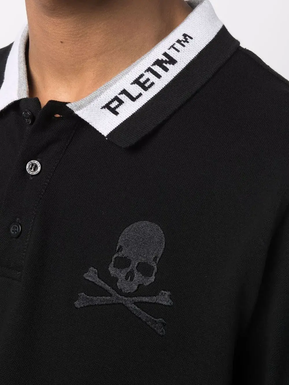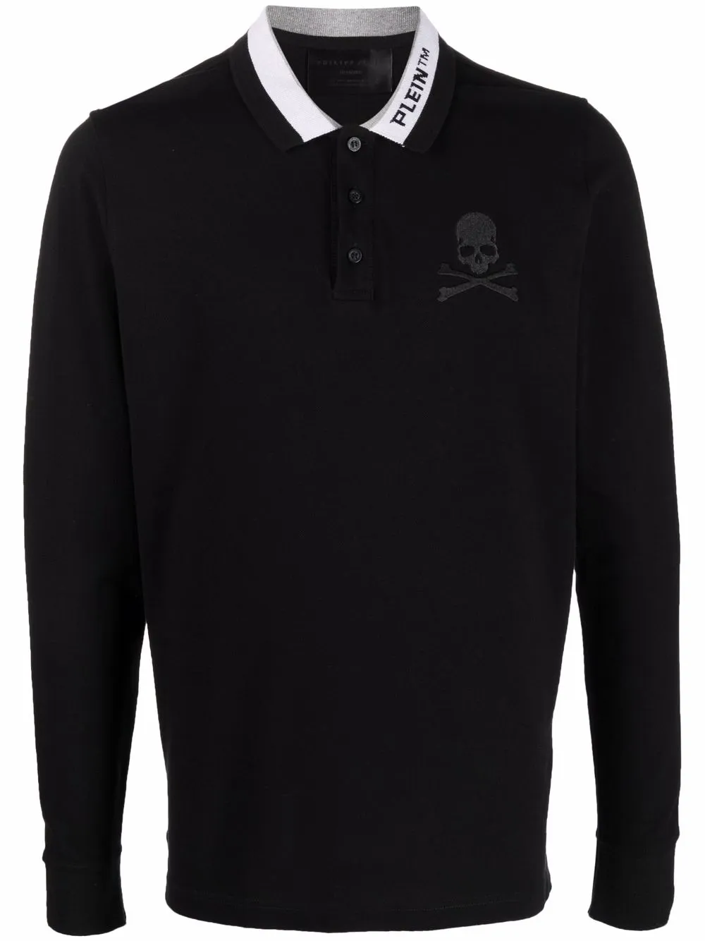 Принт с изображением черепа, логотип спереди, воротник поло и длинные рукава.