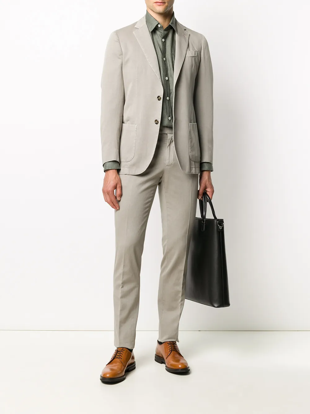Классический воротник, застежка на пуговицах спереди, длинные рукава, два нагрудных кармана с клапанами и прямой подол.