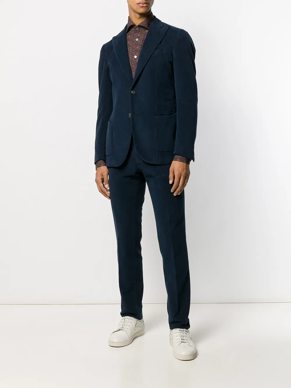 Классический воротник, планка на пуговицах спереди, длинные рукава, узкие манжеты и закругленный подол.