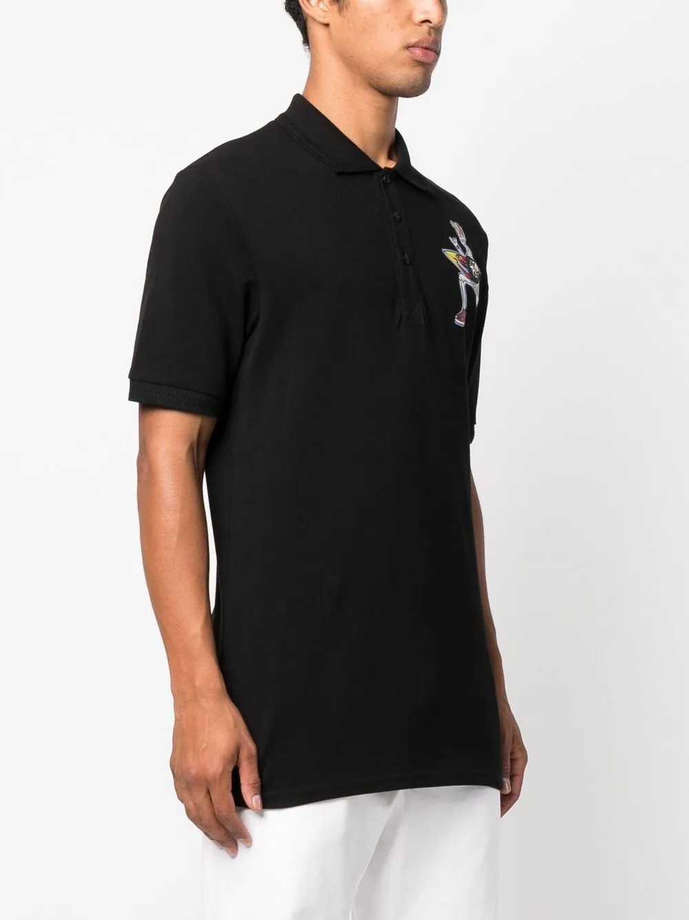 Черный, хлопок, ткань пике, принт на груди, нашивка с логотипом на груди, воротник поло, планка на пуговицах спереди, короткие рукава и прямой подол.