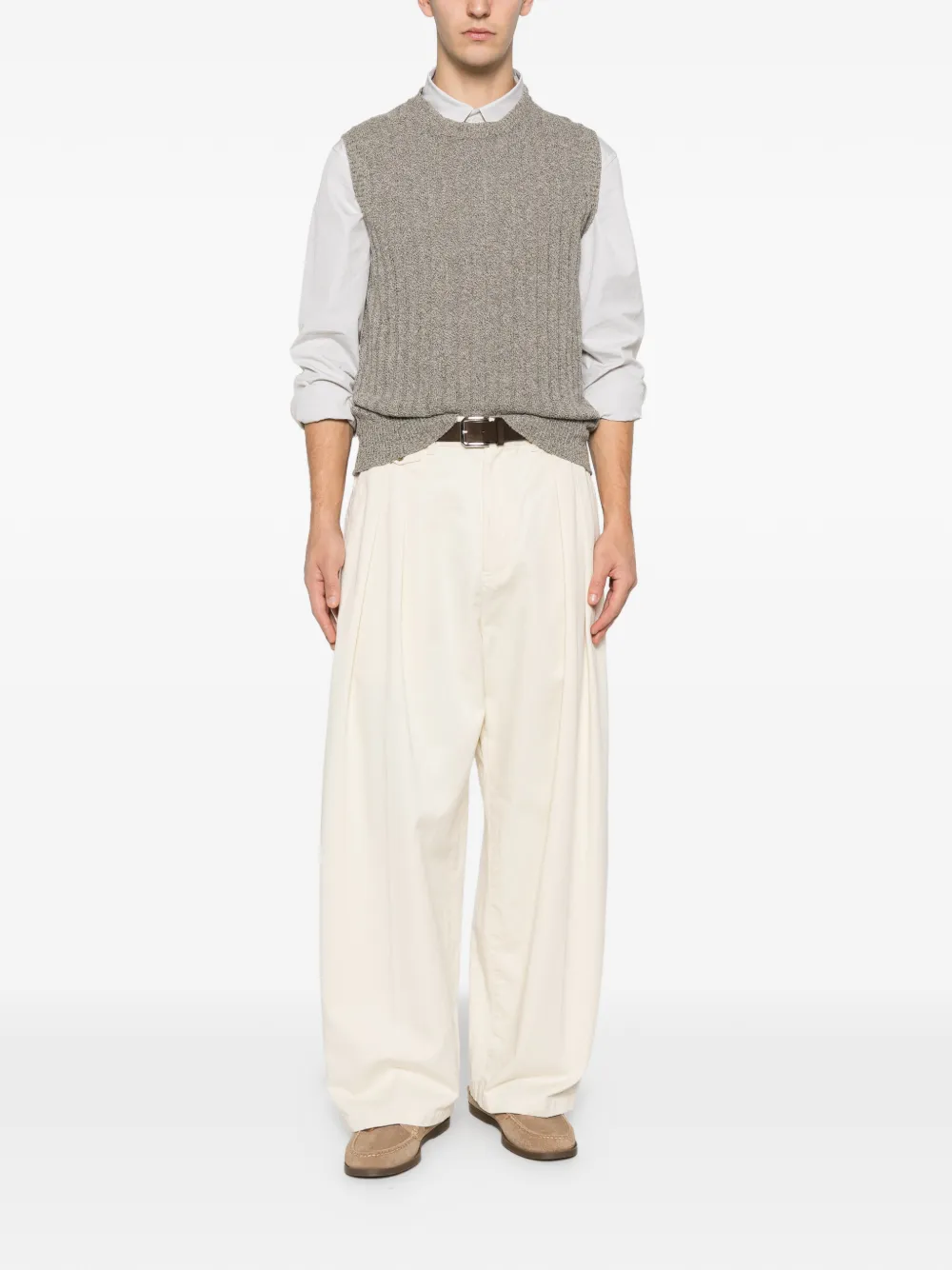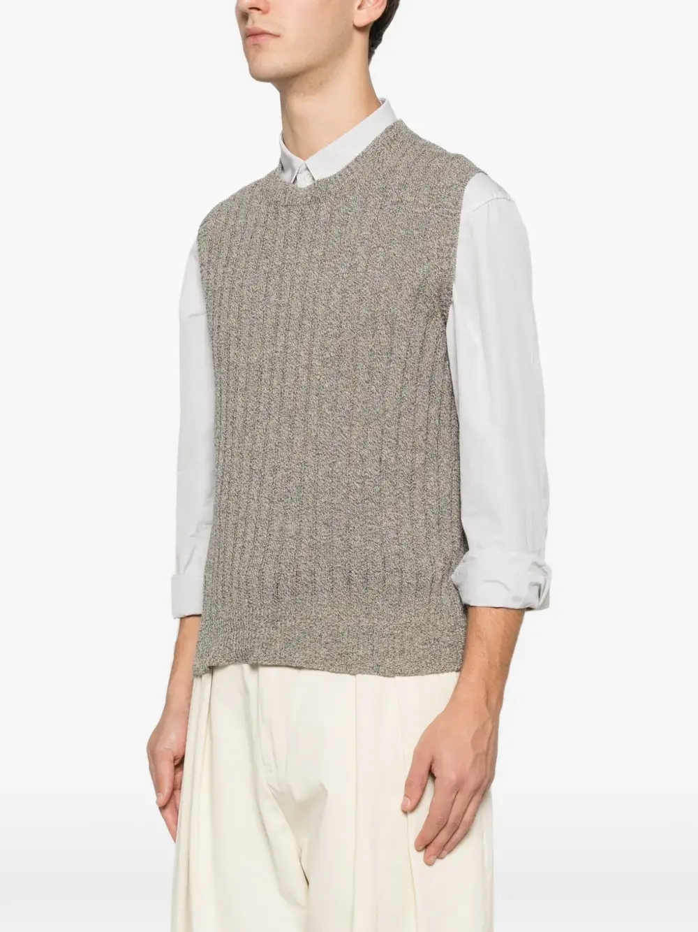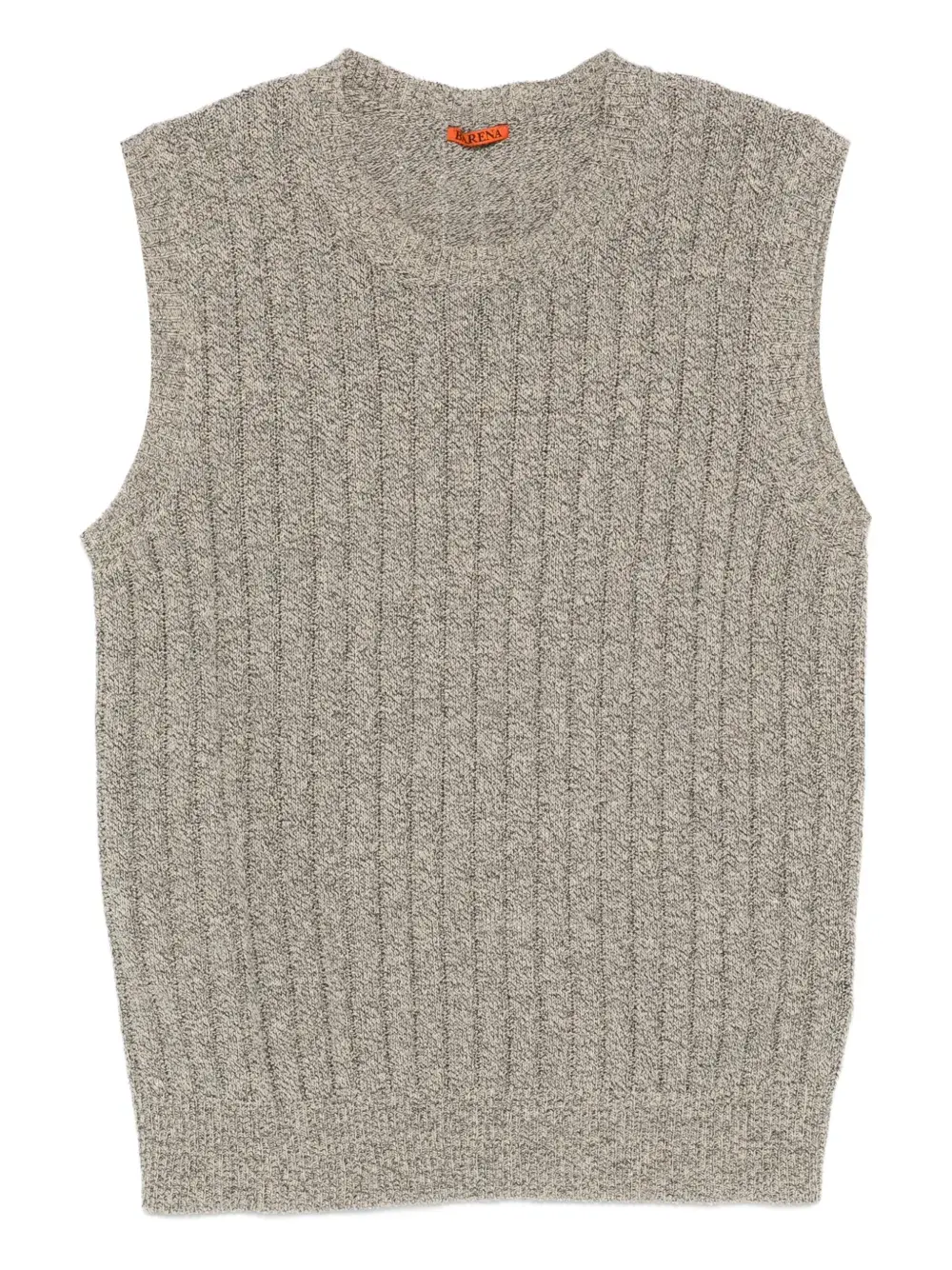Бежевый и темно-синий трикотаж в рубчик без рукавов с круглым вырезом