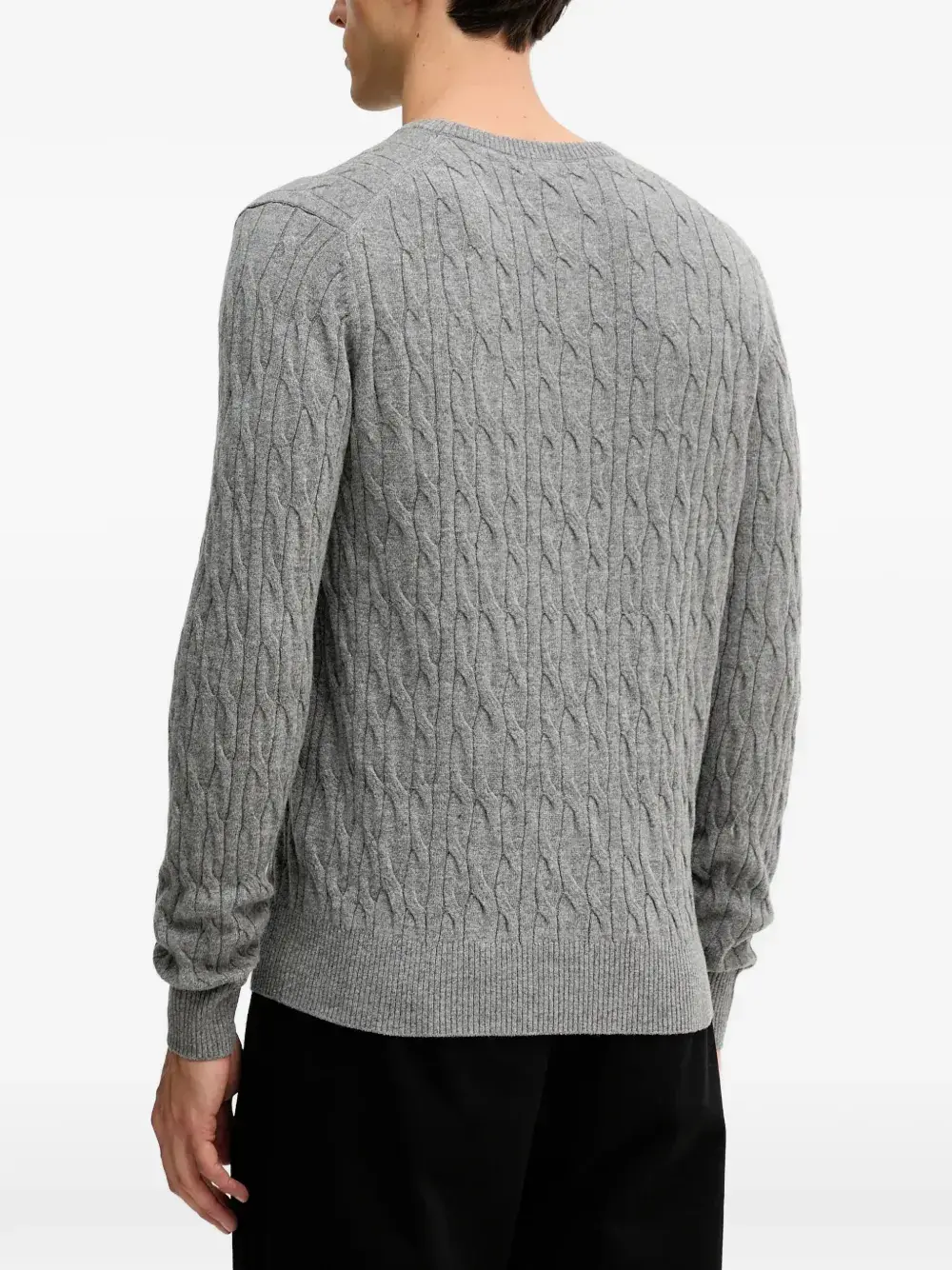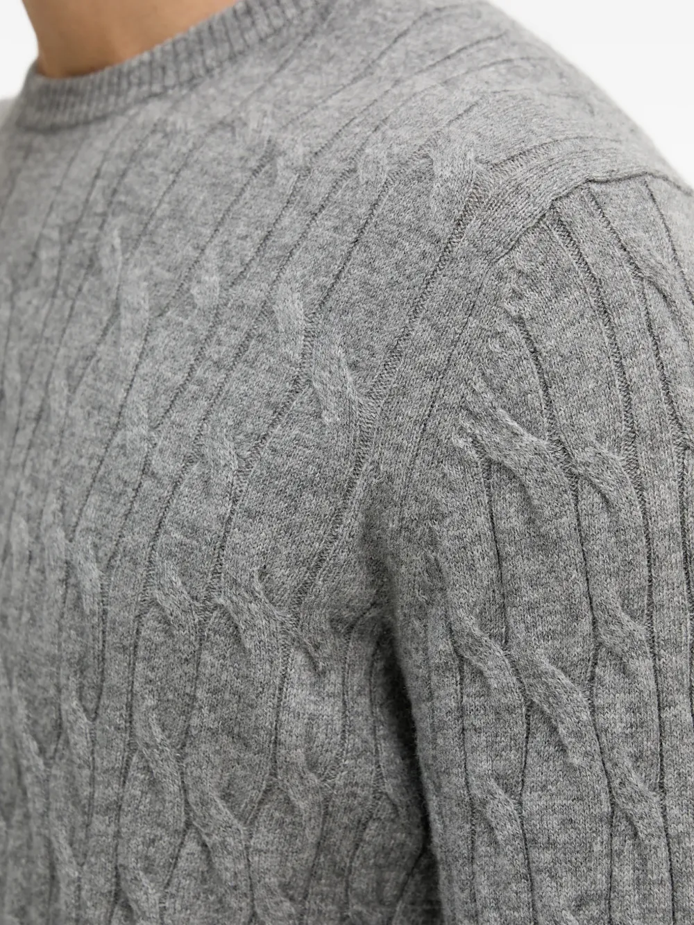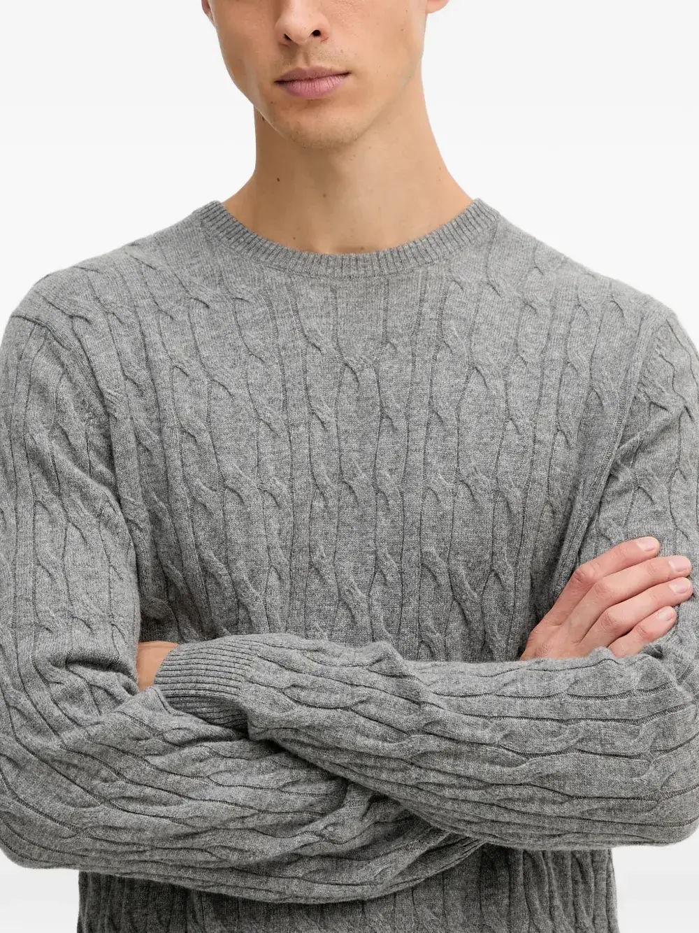 Серый пуловер вязаный косами с круглым вырезом, длинными рукавами, ребристыми манжетами и ребристым низом