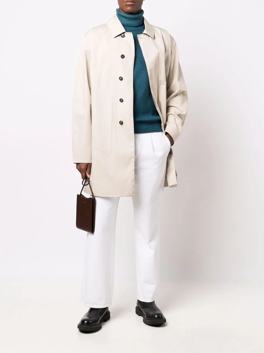 Вязаные края в рубчик, высокий воротник, длинные рукава и прямой подол.